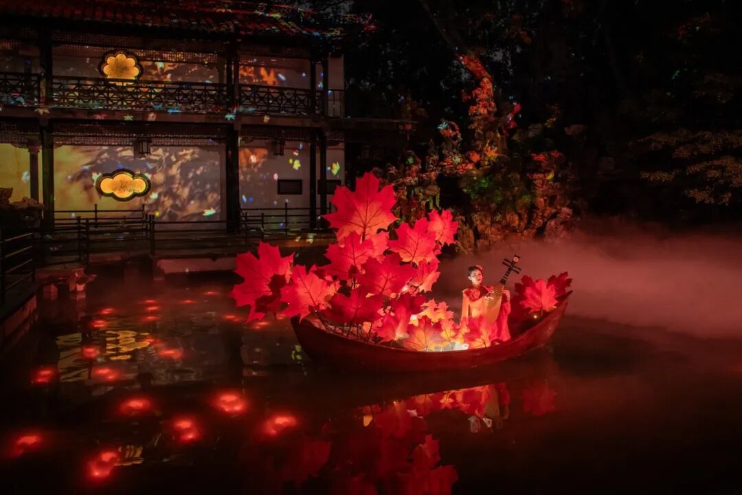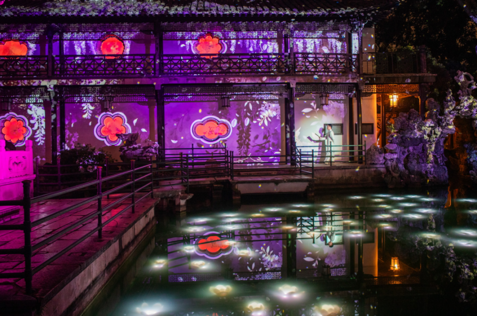 这场以“光影+演艺+互动”为核心的夜演,依托何园“晚清第一园”的建筑肌理,打造了五大篇章:船厅述历史、水心亭展四季之美、玉绣楼显人文底蕴、片石山房现叠石美学、南门赠种传文化,游客在移步换景中感受园林与文化的碰撞。大家纷纷举起手机记录,直呼“视觉盛宴,太震撼了!”