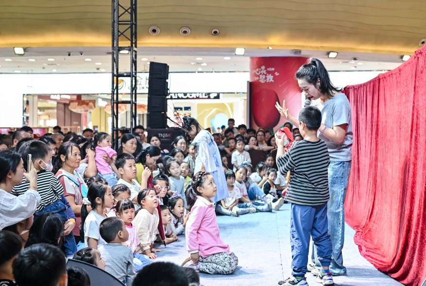 同时,京华城1楼中庭的非遗剧场好戏连台。红歌唱响时,游客们跟着旋律挥舞国旗合唱;木偶表演生动有趣,猜灯谜区域更是热闹,大小朋友围在一起琢磨谜面,答对者还能获赠小礼品。来自扬州本地的刘女士带着孩子连续打卡两天:“既能看非遗表演,又能参与互动,孩子玩得开心,还能感受传统文化,特别适合亲子家庭。”