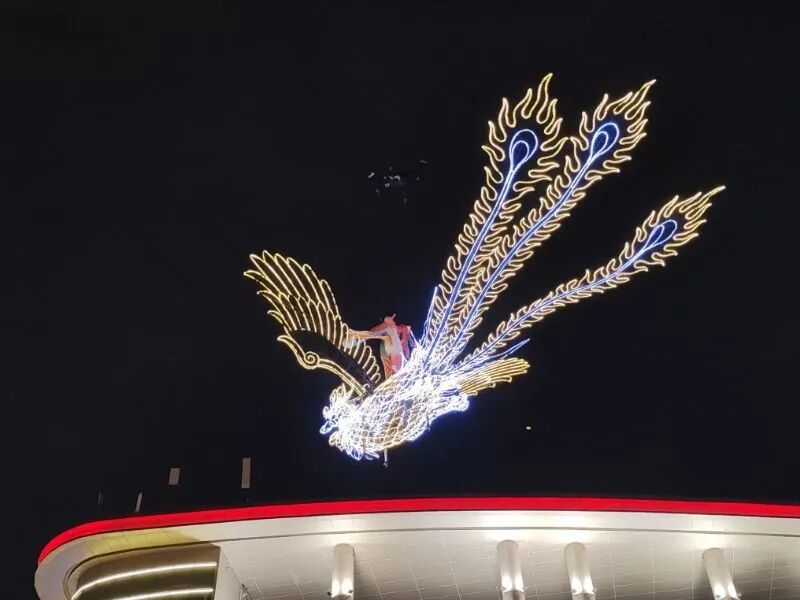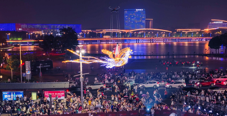 一只金色凤凰载着嫦娥仙子在空中飞翔,嫦娥仙子还不时向下面的观众撒下美丽花瓣……10月1日晚,“嫦娥奔月”空中表演在明月湖畔上演,吸引众多市民和外地游客的目光。