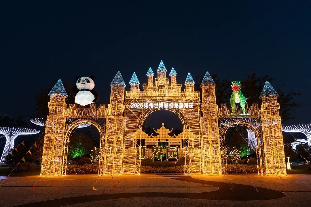 10月2日晚上6点,近百组灯光装置准时点亮世博园,心形廊架流光闪烁、广陵后花园灯影婆娑,搭配主题灯展,成为情侣与拍照爱好者的网红打卡点。不少游客穿梭在灯光场景中打卡留念,浪漫氛围拉满。
