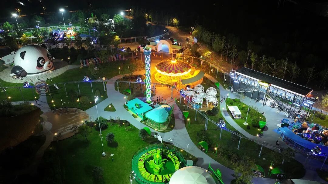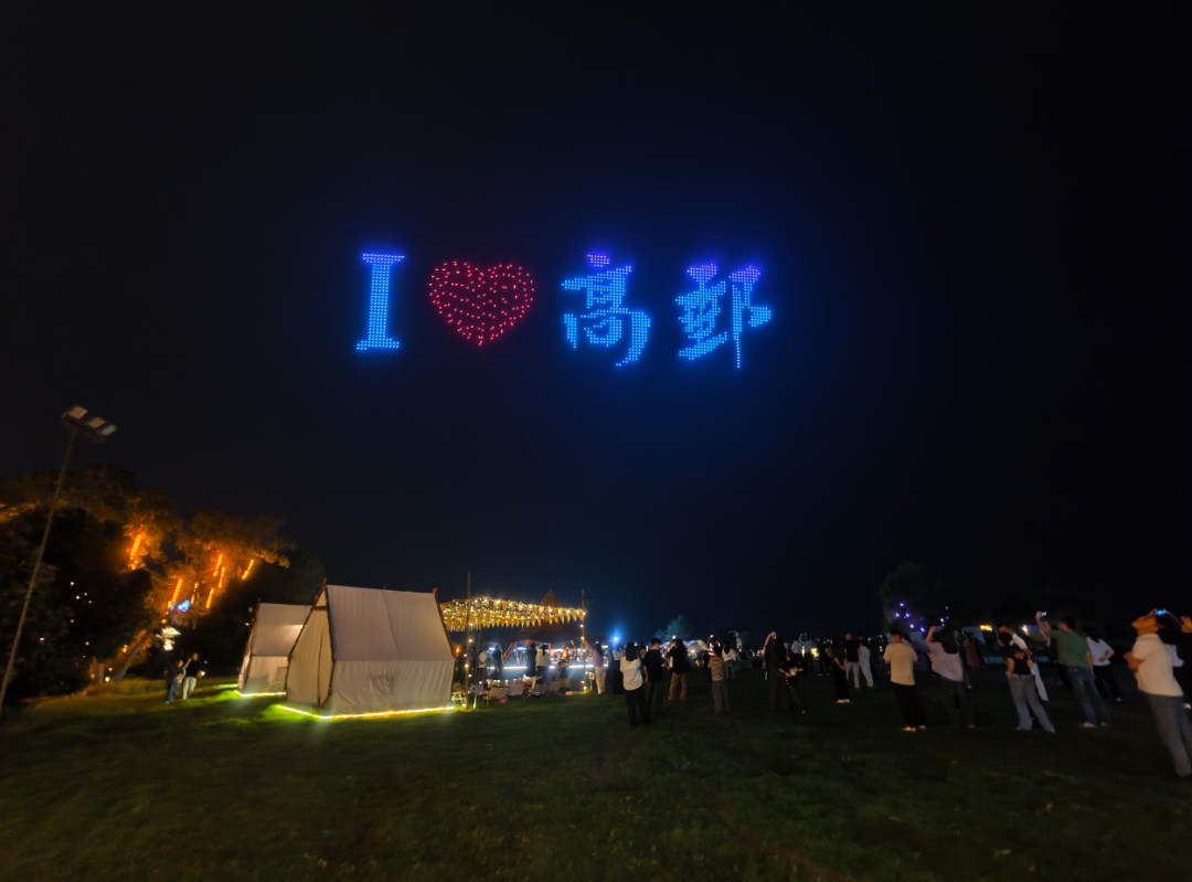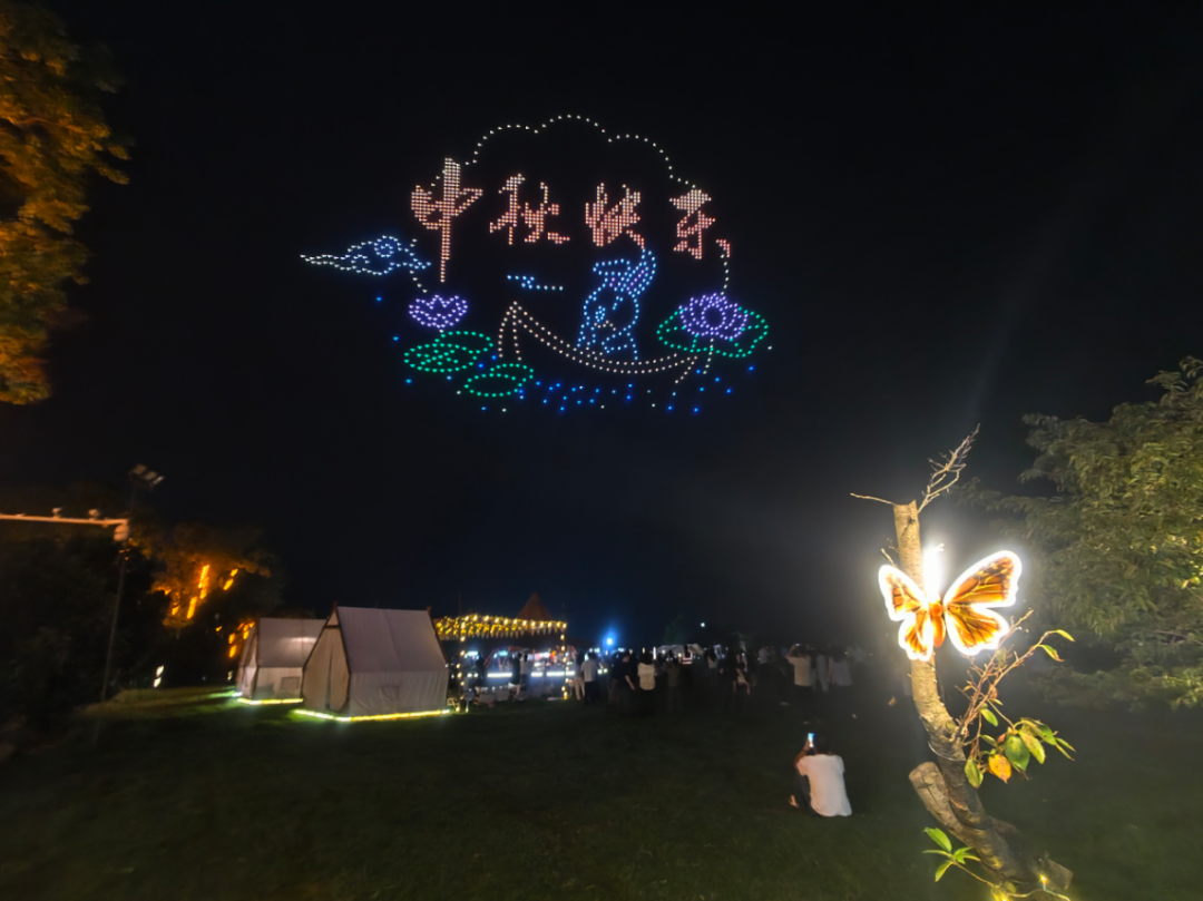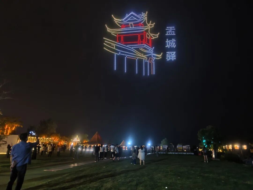 夜幕降临,高邮湖畔的运河西堤营地人头攒动。游客一边参与湖畔音乐会,一边围坐篝火旁享受派对氛围。当数百架无人机组成的 “光影编队” 升空,以 “湖上升明月” 为主题的灯光秀正式上演,变幻的光影在夜空勾勒出月亮、玉兔、高邮地标等图案,瞬间点燃现场气氛。