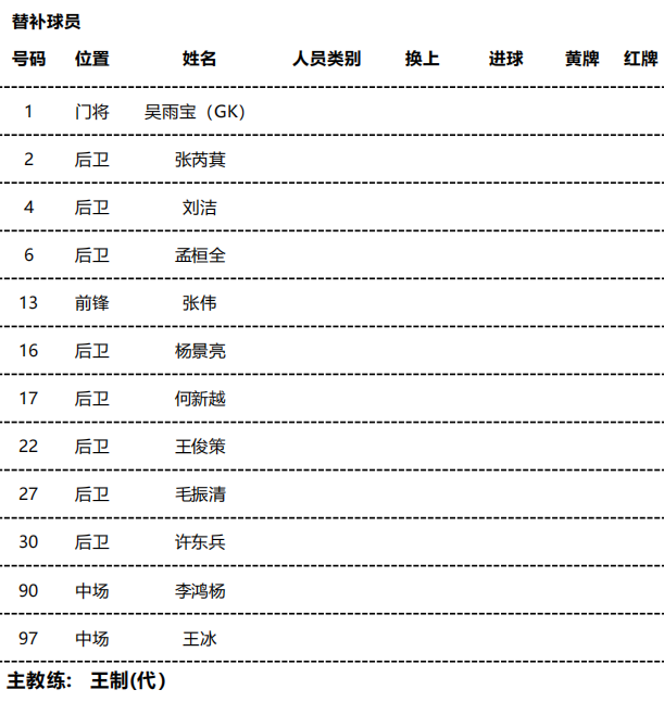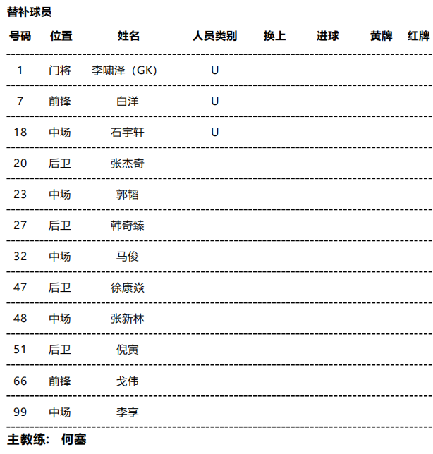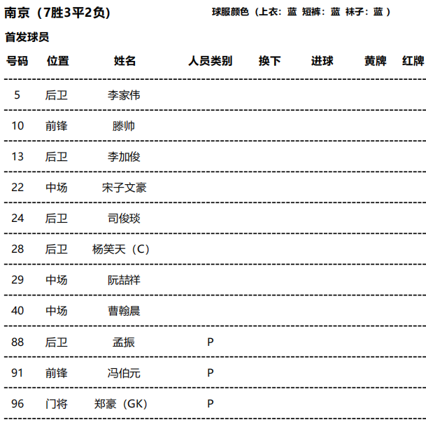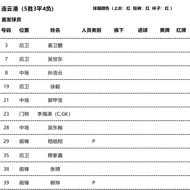 说明:守门员(GK)、队长(C)、职业球员(P)、高校学生(U)、18岁以下球员(Y)、职业大学生球员(P.U.)、职业18岁以下球员(P.Y.)