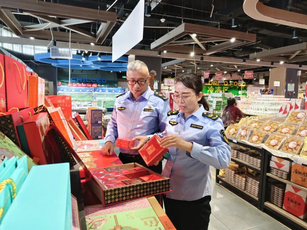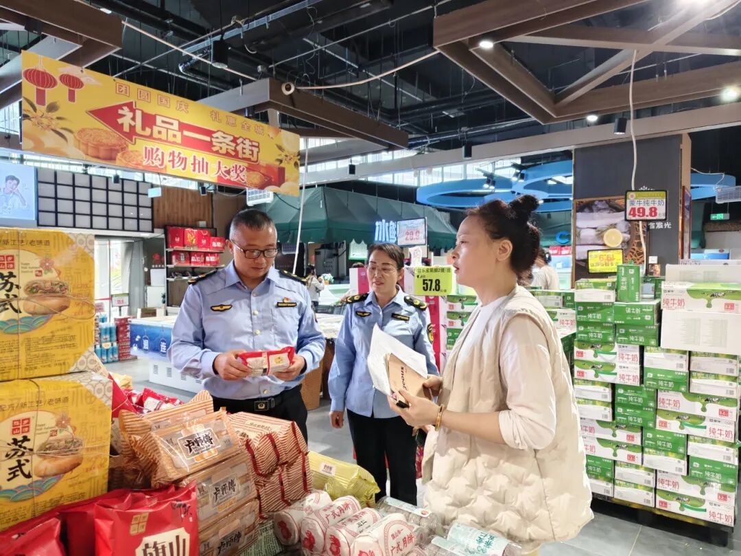 执法人员以大型商超、农贸市场、餐饮单位等为重点场所,针对月饼、粮油、肉制品等节令热销食品开展全面检查。
