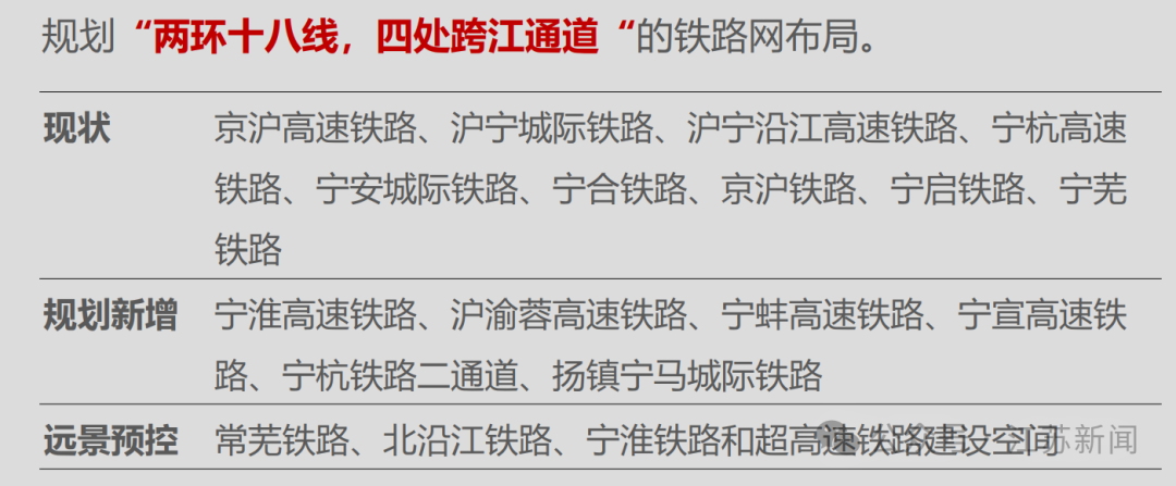 此外,规划新增宁蚌高速铁路、宁宣高速铁路、宁杭铁路二通道、扬镇宁马城际铁路等。