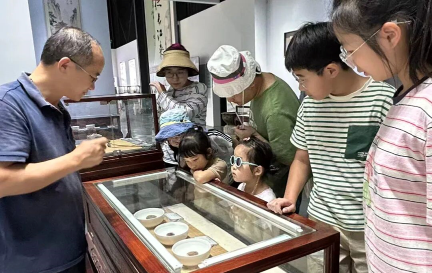 展览现场,最受少年儿童追捧的当属“雨花石寻宝”互动环节。孩子们化身“小小探险家”,在家长的陪同下穿梭于指定区域,仔细搜寻藏在角落的雨花石,时而弯腰观察,时而兴奋交流,清脆的欢呼声与笑声此起彼伏。