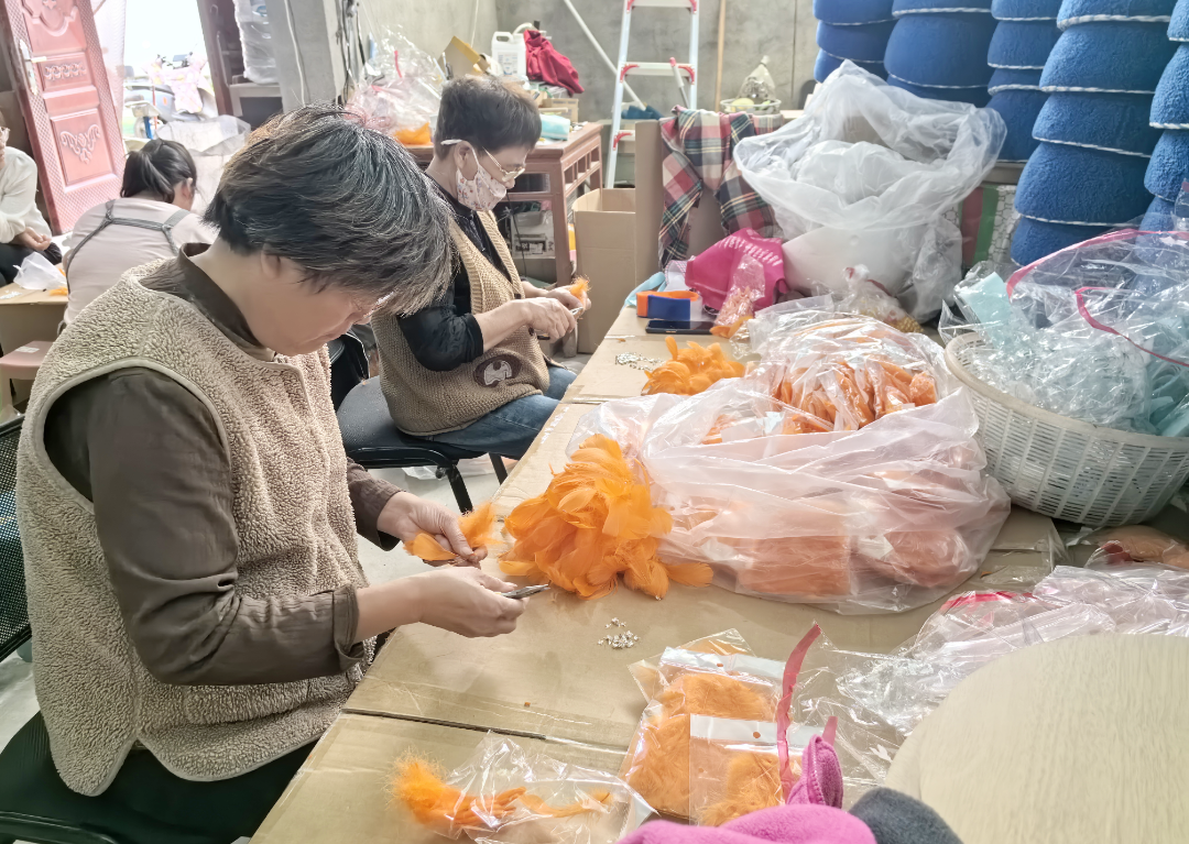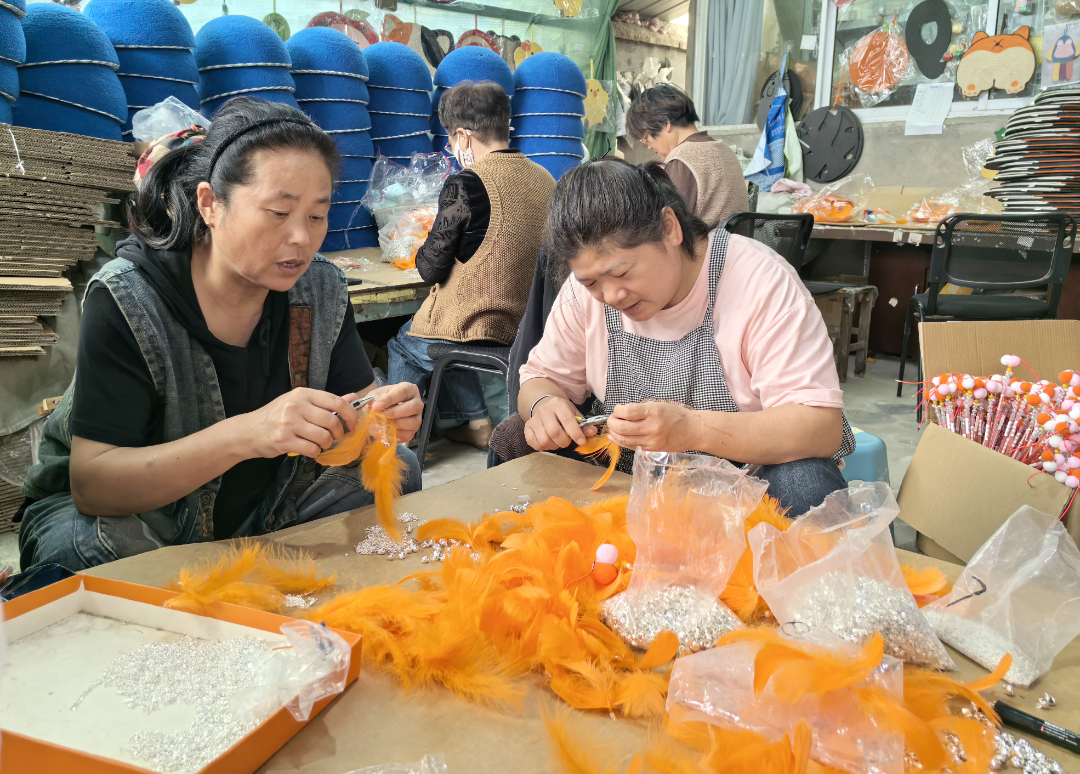 走进麦萌手工制品厂,村民们正有条不紊地忙碌着。大家围坐在工作台前制作逗猫棒,手中灵巧地转动着铁扣和羽毛;另一边,村民仔细地包装逗猫棒,确保每件产品整齐美观。同时,还有村民忙着装箱,动作娴熟地将包装好的产品放入纸箱,封箱、贴标,一切井然有序。