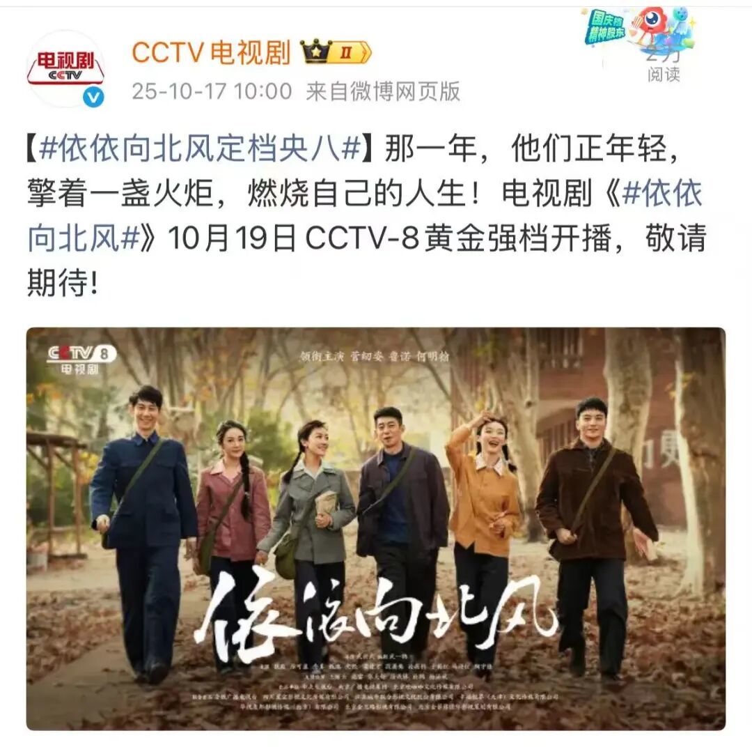 如今,一部从南京走出的年代剧《依依向北风》,将把这段激荡岁月搬上荧幕。就在刚刚,@CCTV电视剧 官方微博宣布这部年代剧将于本周日(10月19日)起登陆央视八套黄金档,38集连播,带观众重温上世纪七八十年代的热血与温情。