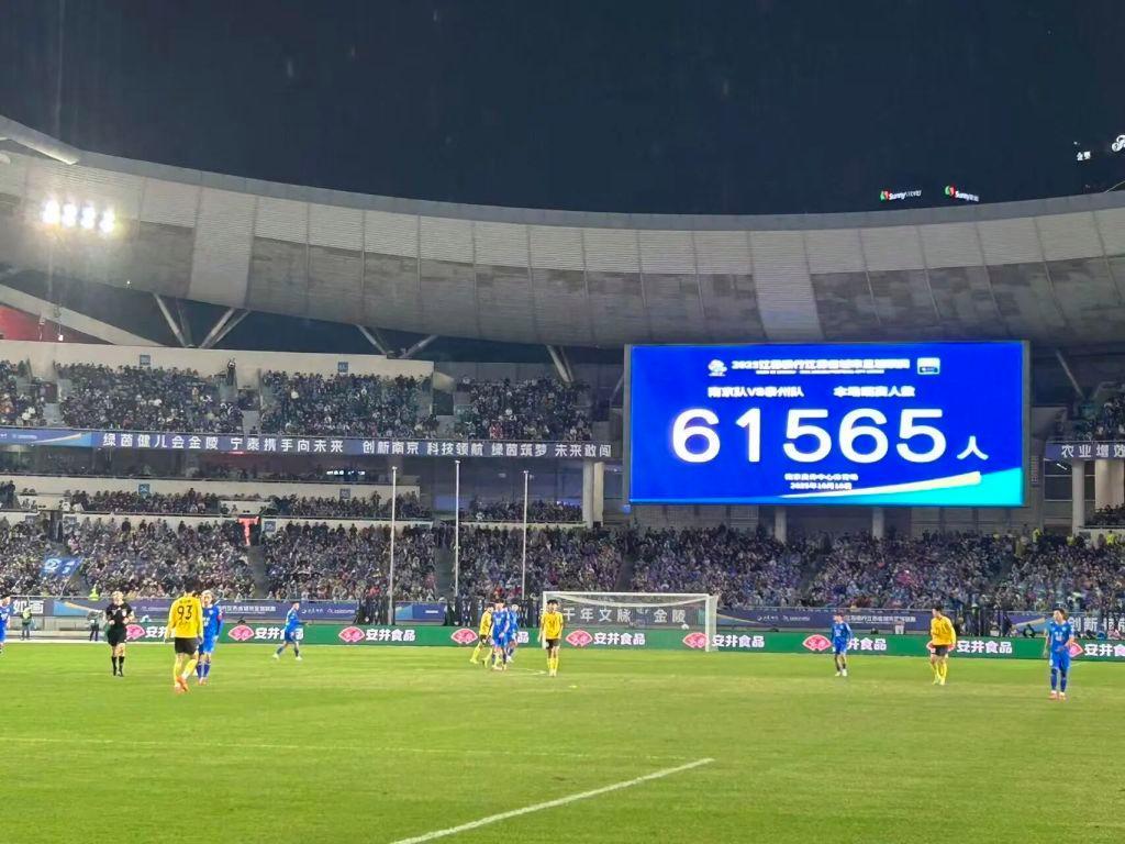 在“苏超”常规赛阶段,13轮78场比赛现场观赛总人数211.89万人,场均2.7万人,线上直播观看人次超17.35亿。进入淘汰赛后,四场“八强战”场均4万人现场观赛。其中,南京队主场南京奥体中心自7月以来六次创造“苏超”现场观赛人数纪录。10月18日的半决赛,南京队坐镇主场对战泰州队,现场涌入61565名球迷观赛,再次刷新中国业余足球赛事的上座人数纪录。