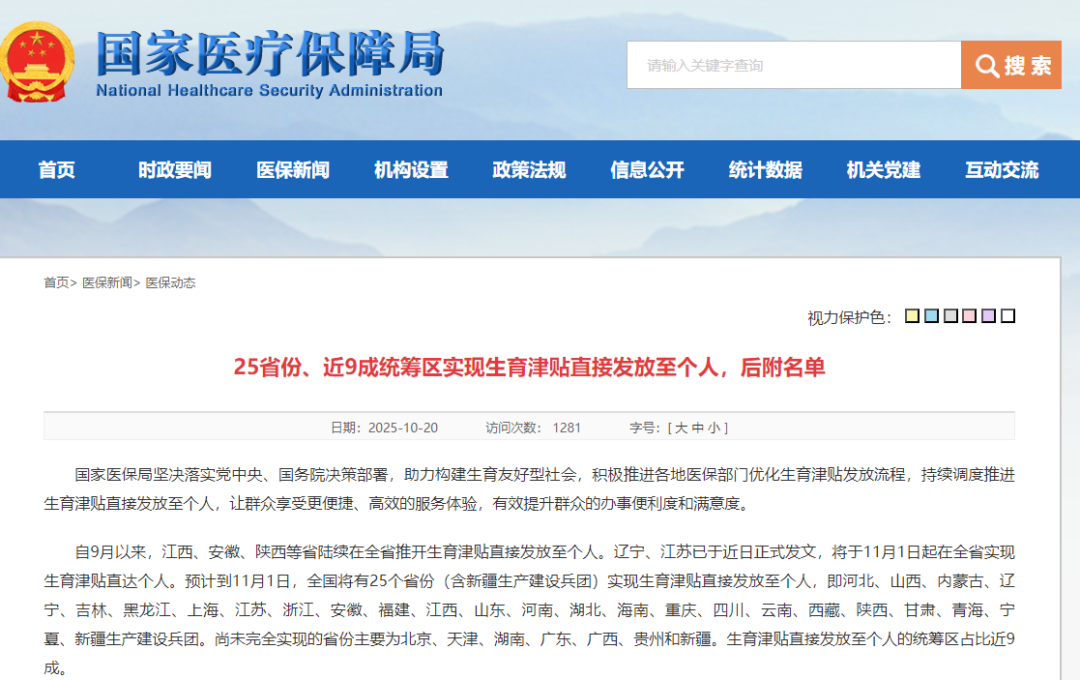 10月20日,国家医疗保障局官网显示,从11月1日起,江苏在全省实现生育津贴直达个人。