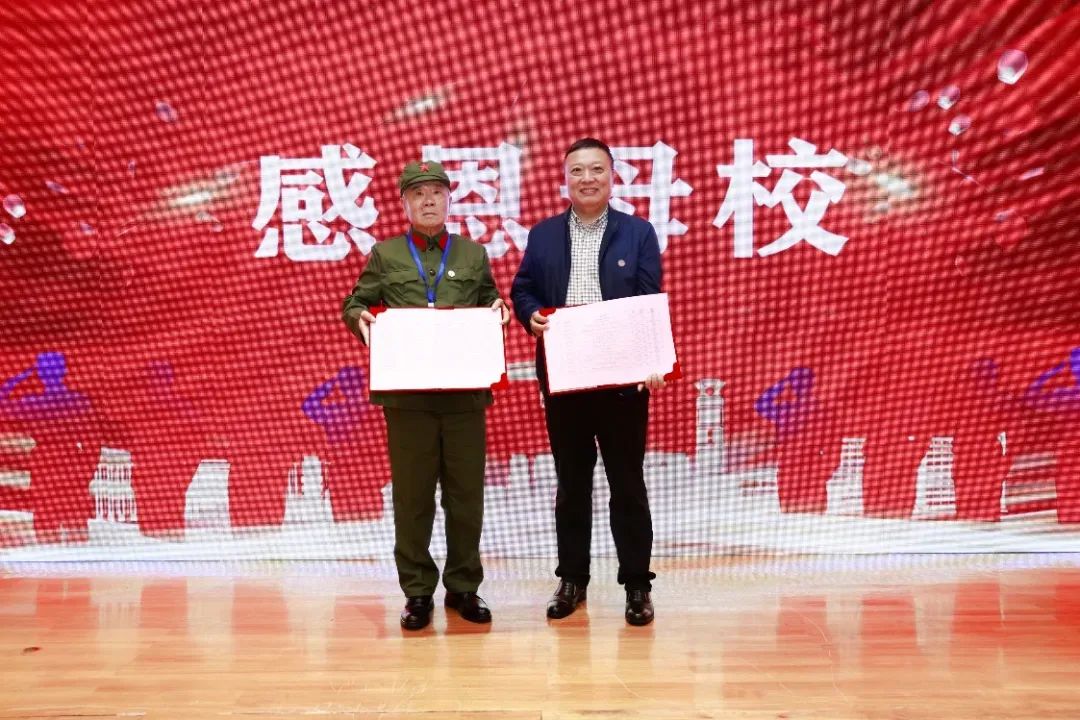 致辞结束后,路贵斌为赵忠令佩戴校徽。