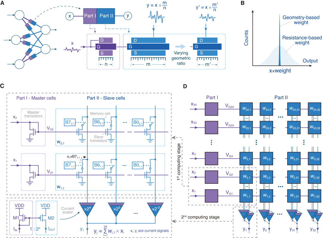 图1:高精度模拟计算方案与电路结构。(A) 概念示意图。本方案利用器件的物理尺寸决定模拟信号的运算关系。(B) 实现效果示意图。利用器件物理尺寸的稳定性,本方案可实现超越传统方案的计算精度。(C) 计算单元原理图。通过两级依赖尺寸比例的电流拷贝电路设计,结合存储单元和开关器件,构建了等效尺寸比例可编程的计算单元,实现输入电流与8比特权重的模拟乘法运算。(D) 计算阵列原理图。通过阵列化排布计算单元,设计高精度电流域向量-矩阵乘法芯片。