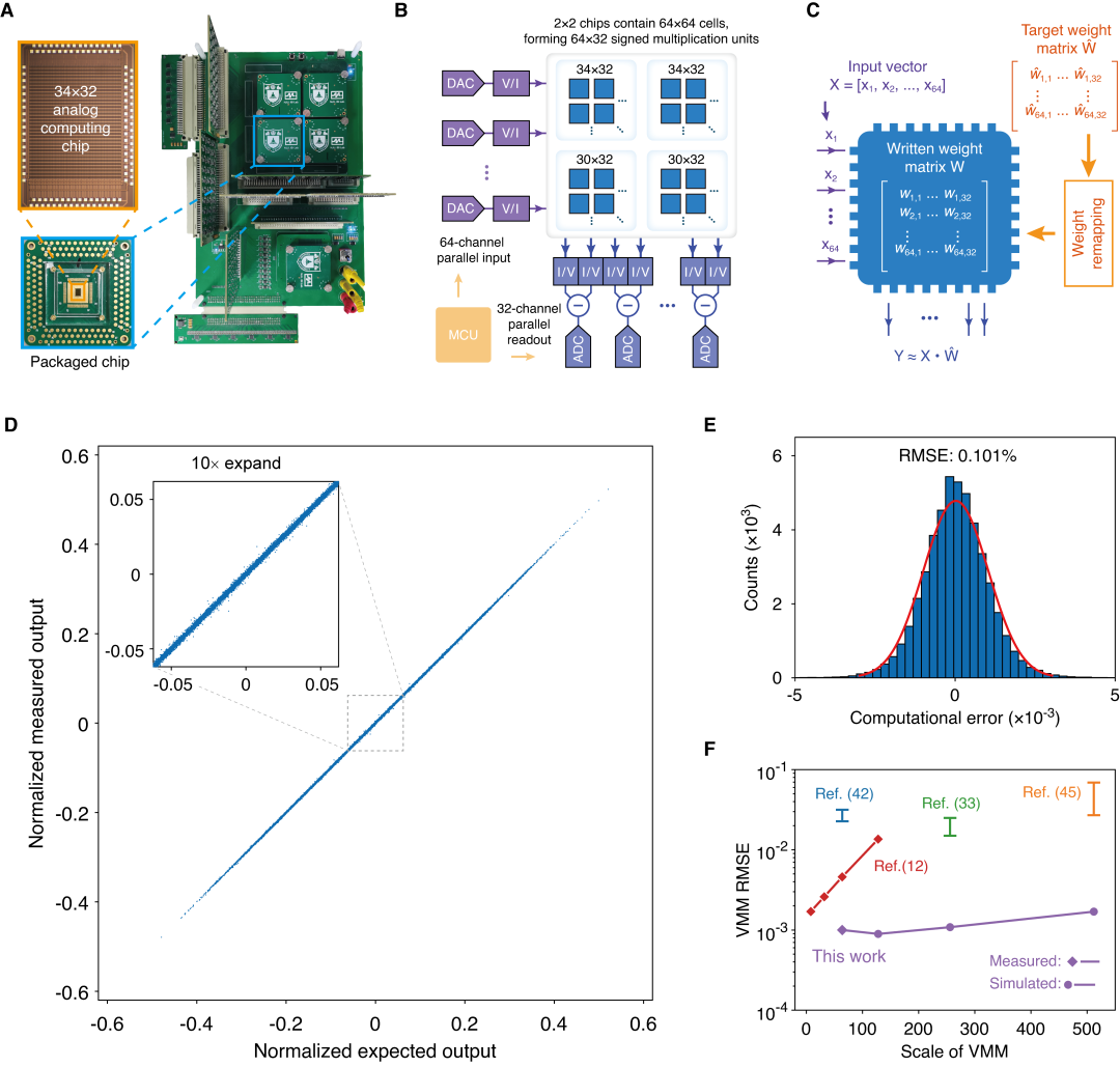 图2:高精度模拟向量-矩阵乘法测试。(A) 芯片和测试电路照片。(B) 模拟向量-矩阵乘法精度测试电路原理图。(C) 权值重映射方法示意图。该方法能进一步提高芯片计算精度。(D) 1500组随机向量-矩阵乘法结果。理想输出与实际输出几乎重合。(E) 归一化计算误差的分布图,统计得其均方根仅为0.101%。(F) 本芯片与其他先进模拟计算方案的精度对比。