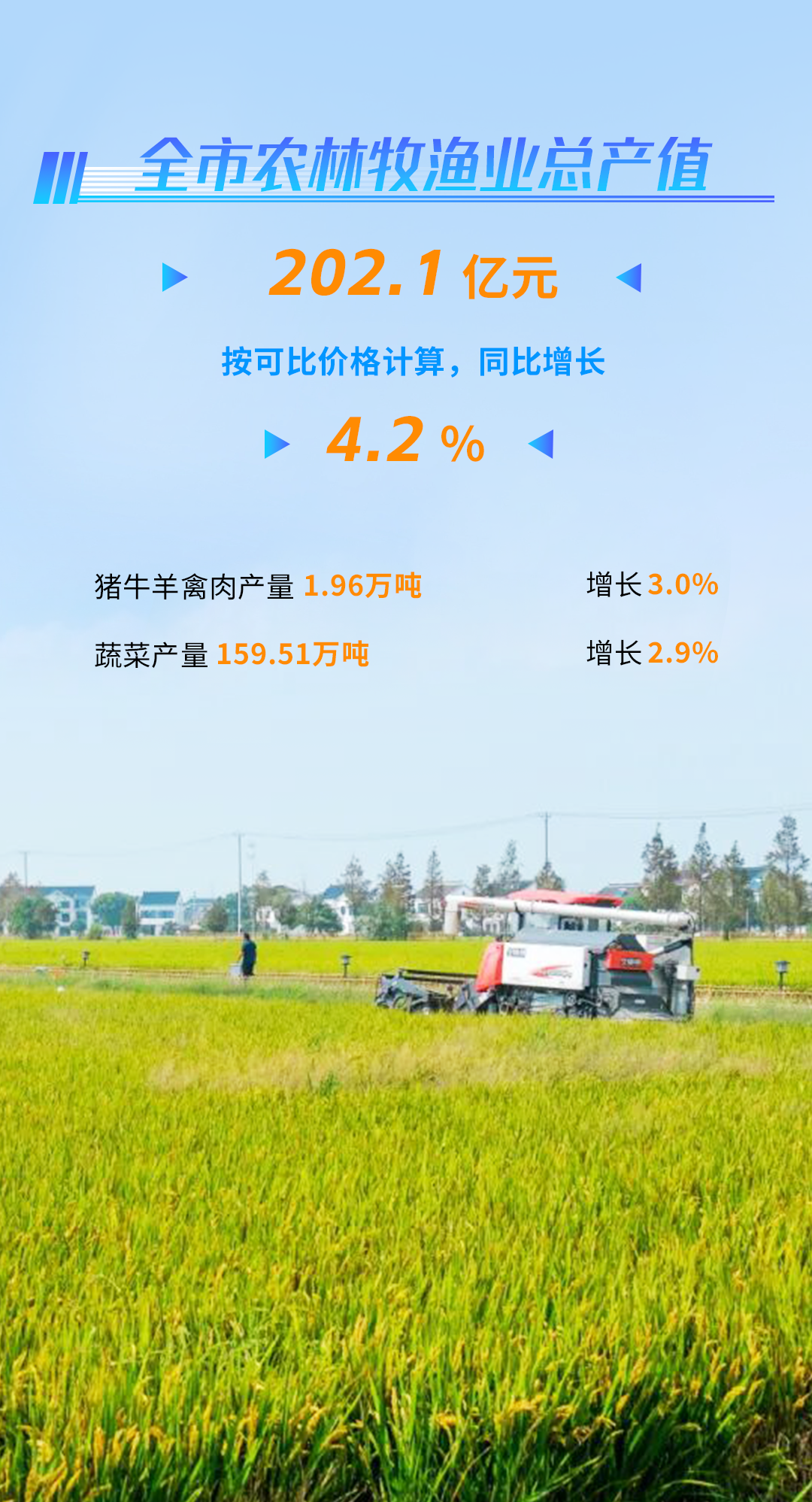前三季度,全市实现农林牧渔业总产值202.1亿元,按可比价格计算同比增长4.2%,其中农业产值增长6.0%,牧业产值增长10.7%。秋粮长势基本稳定。前三季度猪牛羊禽肉产量1.96万吨,同比增长3.0%,其中猪肉产量1.85万吨,增长2.7%。蔬菜产量159.51万吨,增长2.9%。水产品产量9.04万吨,增长0.3%。9月末全市生猪存栏20.50万头,同比增长13.7%。前三季度生猪出栏23.36万头,同比增长5.7%。