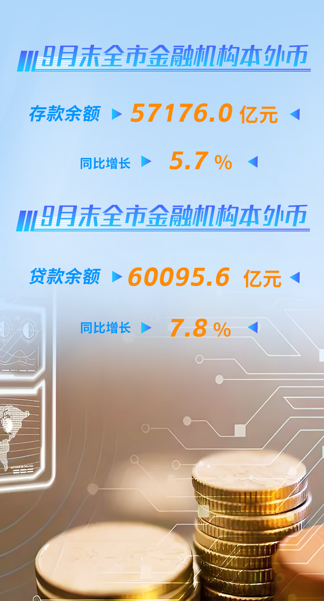 9月末,全市金融机构本外币存款余额57176.0亿元,同比增长5.7%;金融机构本外币贷款余额首次突破6万亿元,达60095.6亿元,增长7.8%。资本市场扩容。前三季度全市新增境内外上市公司12家,其中境内上市公司7家。9月末全市上市公司277家,其中境内上市公司225家,科创板57家。