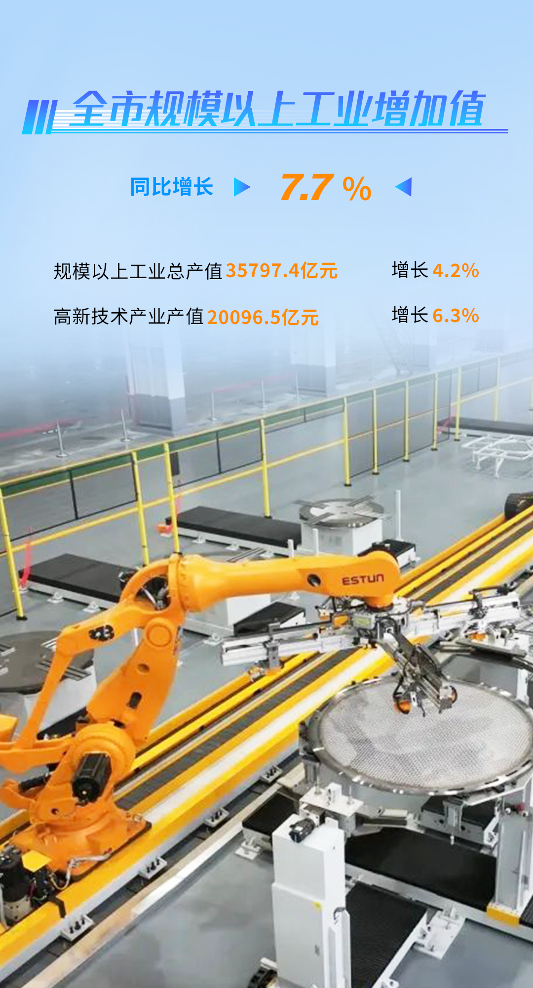 前三季度,全市规模以上工业总产值35797.4亿元,同比增长4.2%。规模以上工业增加值同比增长7.7%。重点行业有力支撑。全市工业行业产值增长面达73.5%,其中电子信息业产值同比增长6.1%,电气机械和器材制造业产值增长5.0%,两大行业合计拉动规模以上工业总产值增长2.2个百分点。产业向新向优发展。前三季度全市规模以上高新技术产业产值20096.5亿元,同比增长6.3%;高新技术产业产值占规模以上工业总产值比重达56.1%,同比提高1.5个百分点。高新产品产量快速增长。光电子器件、工业机器人、锂离子电池等产品产量分别增长10.0%、20.6%和55.9%。