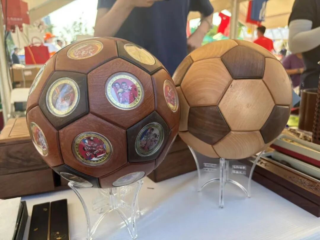 不止于蓝印花布,海门匠人以赛事为灵感,交出了更多“传统+体育”的创新答卷。红木匠人巧用榫卯结构打造的足球摆件,将传统木工技艺与足球运动的动感完美融合;本土品牌希诺定制的苏超主题保温杯,兼具实用价值与纪念意义。这些文创产品不仅在赛事期间成为热销爆品,更通过观赛游客的传播,让海门文化符号走向更广阔的舞台。