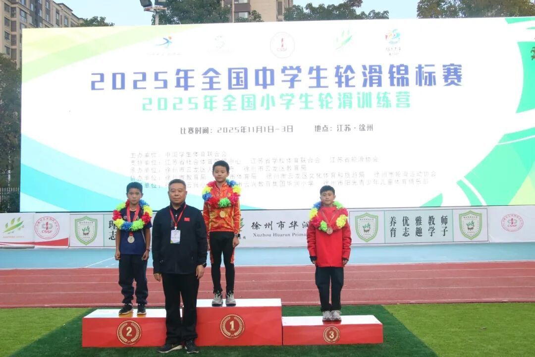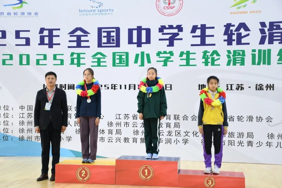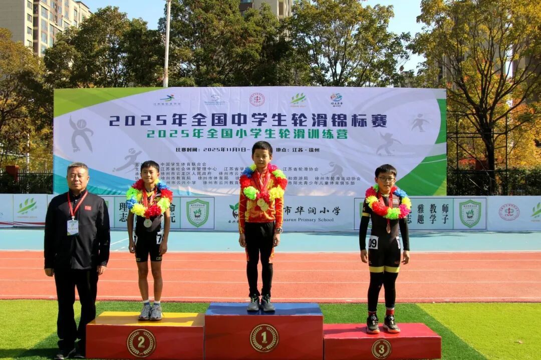 徐州市汉景小学宋梓萱则在自由式轮滑小学女子甲组速度过桩项目中摘得金牌,