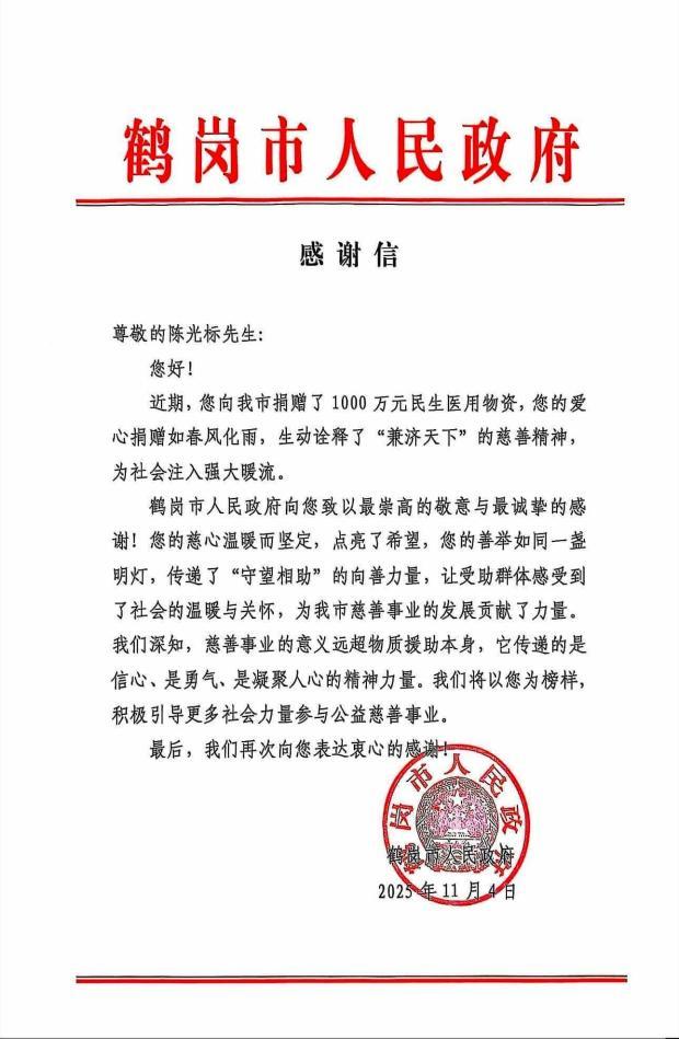 此次向鹤岗市的捐赠,既是陈光标公益版图的又一延伸,也为寒冷冬日里的民生保障送上了温暖注脚。未来,随着“内外联动”公益格局的深化,其善举将继续惠及更多需要帮助的群体。