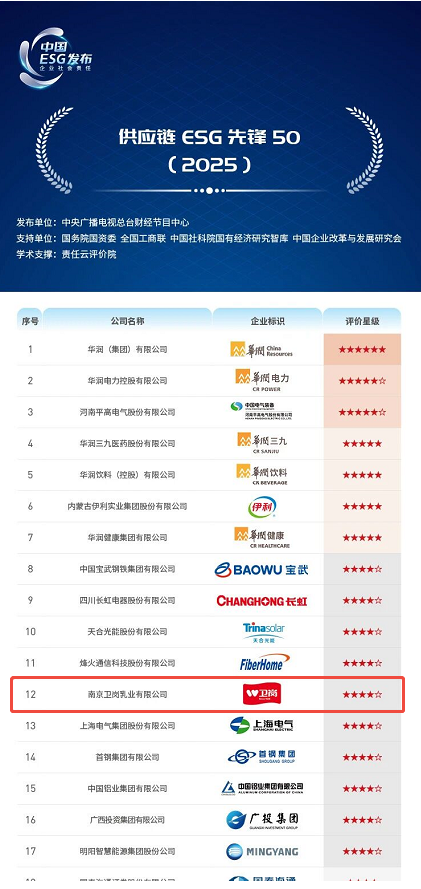2025年10月24日,中央广播电视总台发布《供应链ESG行动报告(2025)》,基于《财富》中国500强等榜单对400家企业进行系统评估,并公布“供应链ESG先锋50(2025)”榜单。南京卫岗乳业有限公司以四星半评级位列全国第十二名,成为供应链ESG实践的标杆企业。