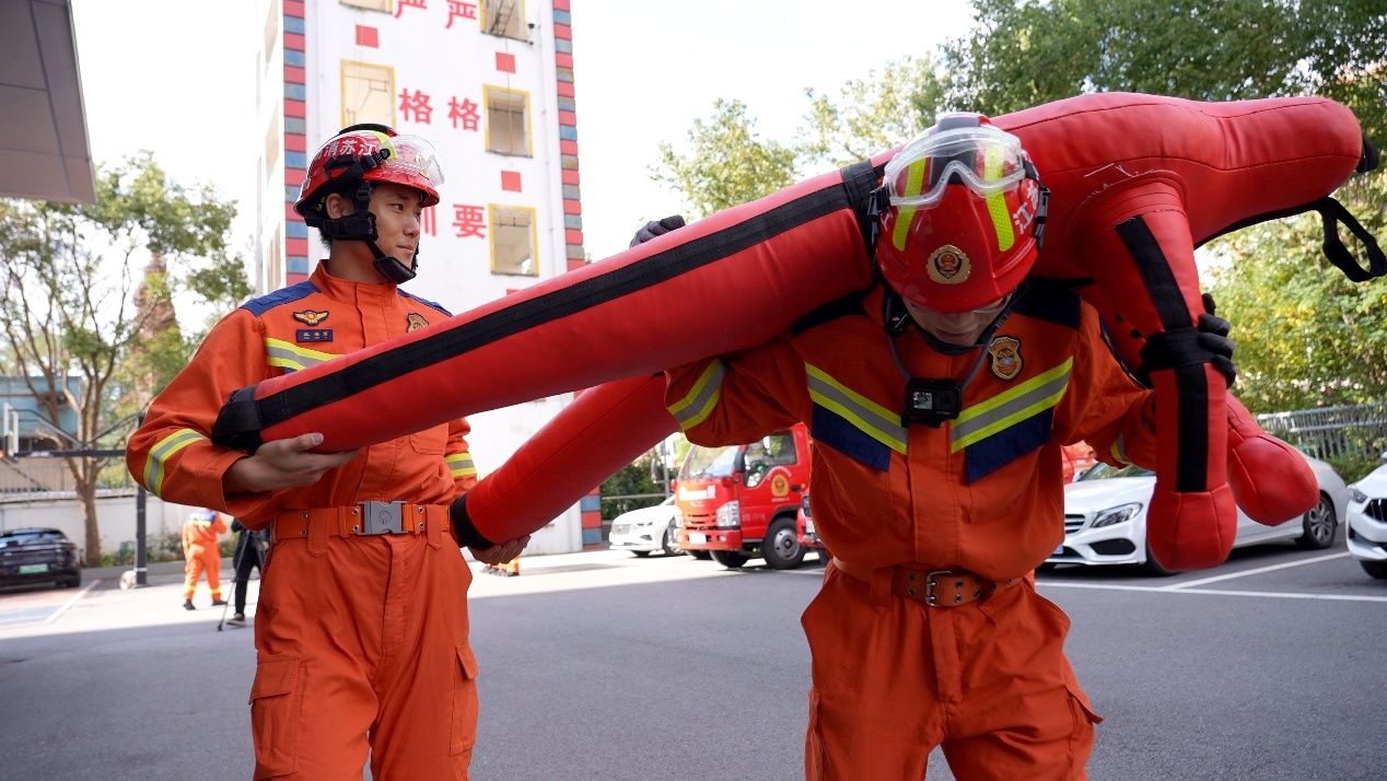 随后的水带操训练更是力量与技巧的结合。消防员甩出的水带如银蛇出洞,迅速笔直,完成整套动作如行云流水,仅需13秒。反观记者,水带在手中扭成了“麻花”,用时数倍,狼狈不堪。然而,真正的“下马威”是模拟火场救援的负重登楼。当记者穿上重达30斤的灭火服,再背上30斤的空气呼吸器时,一股巨大的压力瞬间从肩膀传遍全身。记者喘着粗气,声音在厚重的面罩后变得沉闷,“我感觉肩膀像压了一座山,光抬脚就很费力。”消防员顾轩源在一旁解释:“整套灭火防护服配备整齐,加上水带差不多是40公斤。我们的标准是,穿着这身装备,从1楼到10楼,必须在1分钟内完成。”为什么必须这么快?队长解释说:“因为火场里的群众可能在更高楼层等着我们。而一个满压的空气呼吸器,在剧烈运动下只能支撑20分钟左右。对我们而言,每一秒都是在和死神赛跑。”看着消防员们提着水带,在这身“盔甲”的束缚下依然能在楼梯间健步如飞,记者刚爬了几步便已面色通红,大汗淋漓。“这装备真的太重了,我完全不敢想象,他们日复一日进行这样的训练,到底是怎么扛过来的?”