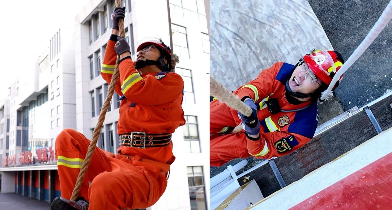 首项训练是攀登挂钩梯以及绳索攀爬,这是消防员扑救楼层火灾的基本技能。在消防员手中,沉重的挂钩梯运用自如,精准挂窗、蹬墙借力、腾挪而上,三两下便已稳稳抵达顶楼,最快仅用14.6秒就完成该项目全过程。但当记者尝试时,发现与日常生活中的梯子截然不同,挂钩梯仅在梯子末端中间位置有一锯形钩子,在攀爬过程中,在风摆和快速攀爬动作的影响下,梯子摆动的幅度特别大,攀爬者很难控制平衡,在艰难中,记者缓缓爬上。“我刚刚尝试了一下,爬了两三层就已经非常费劲了,而咱们消防员可能会爬到6层或者更高的楼层。”稳住身形后,记者向身旁的消防员讨教诀窍。“其实没有诀窍,就是反复练。”消防员徐舟的回答平静而笃定,“我们消防内部有个说法叫‘磨梯子’,就是我们要天天坐在窗台上面,日复一日地打磨技术,直到形成肌肉记忆。火场里没有彩排,每一秒都关乎生命,我们必须快,必须稳,这是在为救援争取黄金时间。”