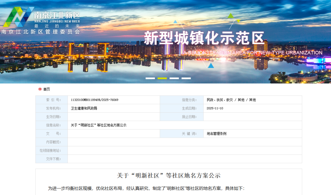 为进一步均衡社区规模,优化社区布局,11月10日,南京江北新区官网发布关于“明新社区”等社区地名方案公示。