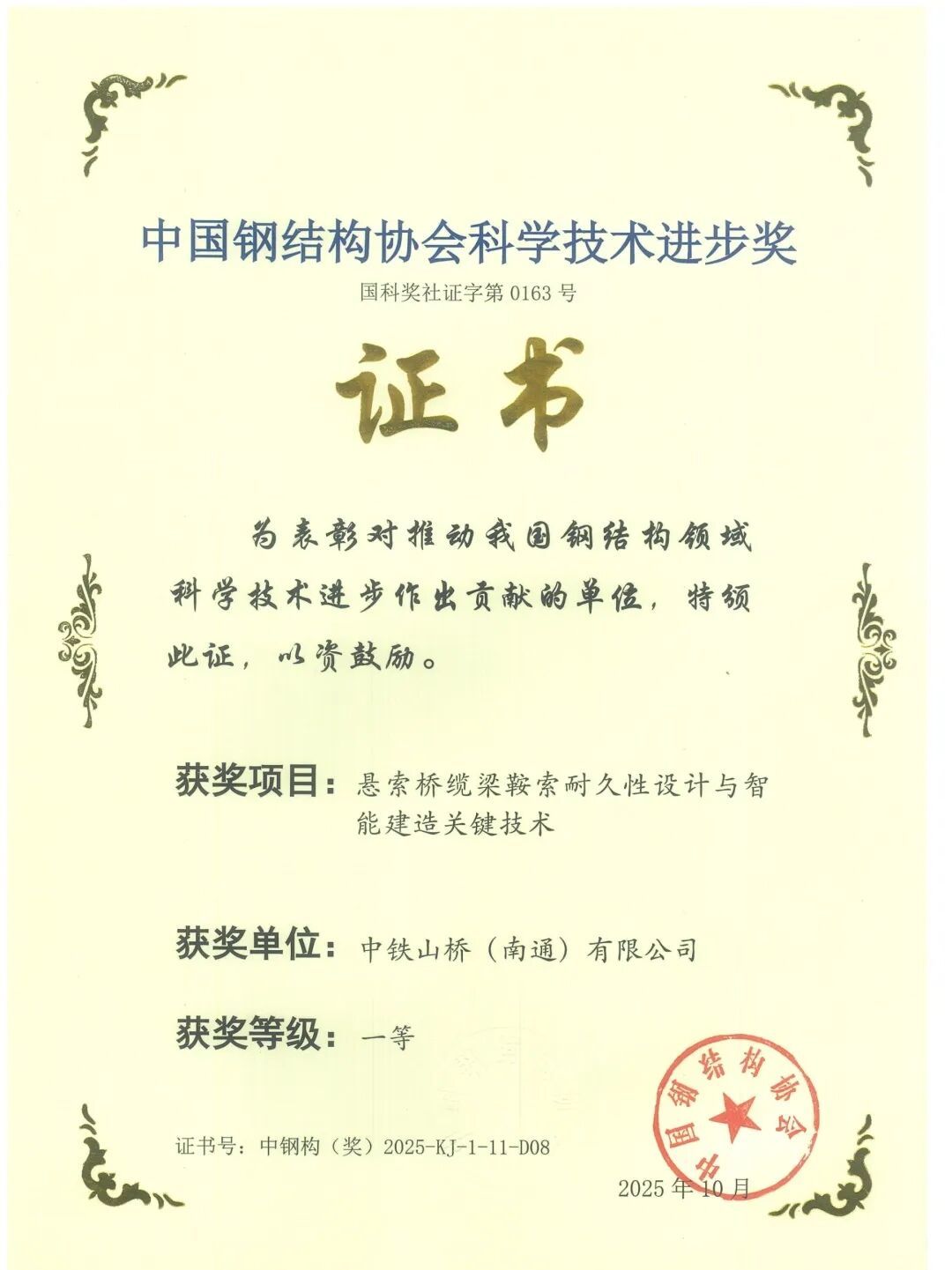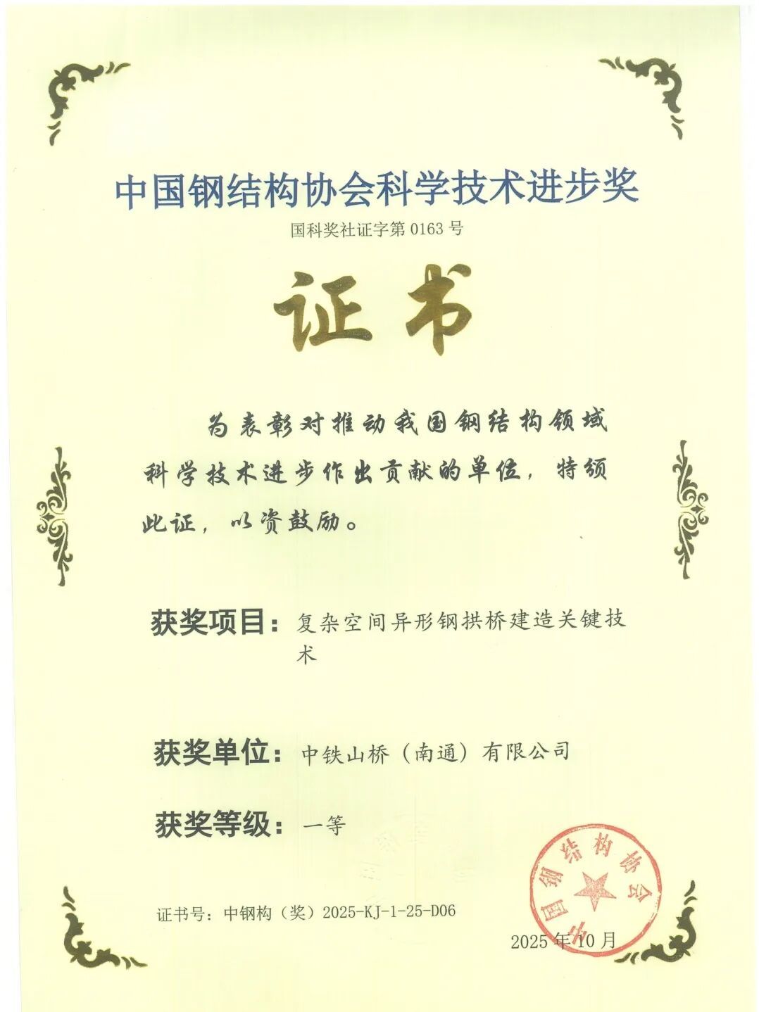 近日,2025年度中国钢结构协会年度科学技术奖评审结果正式揭晓,中铁山桥两项成果《悬索桥缆梁鞍索耐久性设计与智能建造关键技术》《复杂空间异形钢拱桥建造关键技术》双双荣获科学技术进步奖一等奖。
