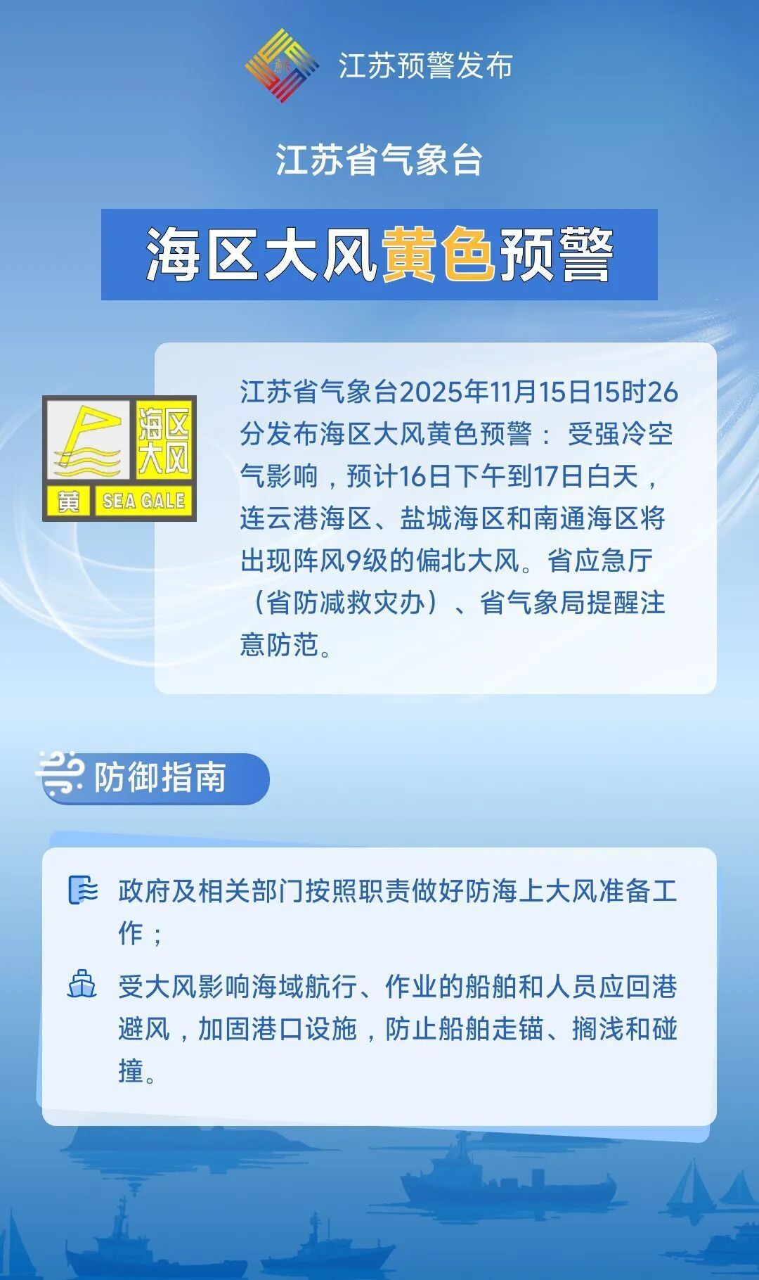 江苏省气象台2025年11月15日15时26分发布海区大风黄色预警: