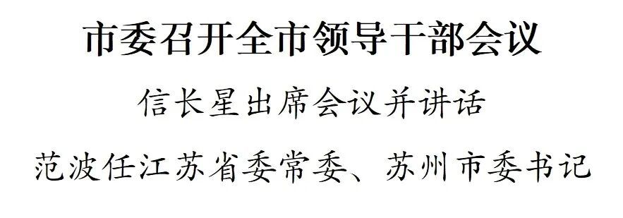 信长星强调,作为东部地区重要的中心城市、全国经济体量最大的地级市,苏州在全国、全省发展大局中处于重要地位。当前正值“十四五”收官冲刺、“十五五”谋篇布局的重要节点,苏州广大党员干部要进一步坚定信心、鼓足干劲,永葆“探路者”的姿态,推动苏州各项工作继续走在前列,在中国式现代化江苏新实践中当好排头兵。要坚持把深入学习贯彻习近平总书记对江苏、苏州工作重要讲话重要指示精神作为贯穿全部工作的主线,把学习宣传贯彻党的二十届四中全会精神作为当前和今后一个时期的重大政治任务,坚定不移沿着总书记指引的方向前进,更加坚定自觉地做到“两个维护”。要坚持高质量发展这个首要任务,完整准确全面贯彻新发展理念,因地制宜发展新质生产力,进一步全面深化改革,扩大高水平对外开放,努力建设具有全球影响力的产业科技创新中心主承载区,更加坚定自觉地扛起挑大梁重大责任。要坚持以人民为中心的发展思想,深化人文经济学研究和运用,用心用情办好民生实事,推动物质文明与精神文明协调发展,统筹好发展和安全,更加坚定自觉地在促进共同富裕上作示范。要坚持以党的自我革命引领社会革命,以党的政治建设统领党的建设各项工作,巩固拓展深入贯彻中央八项规定精神学习教育成果,坚持党性党风党纪一起抓、正风肃纪反腐相贯通,更加坚定自觉地推进全面从严治党。省委相信以范波同志为班长的苏州市委领导班子,一定能够团结带领全市干部群众,齐心协力、砥砺奋进,为谱写“强富美高”新江苏现代化建设新篇章作出新的更大贡献。