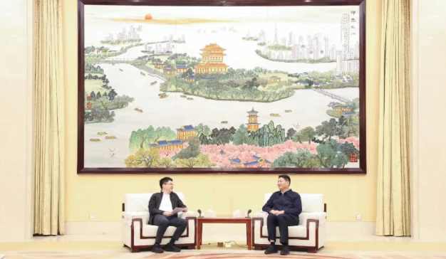 11月14日,市委书记姜冬冬会见全国青联副主席、苏州市青年商会会长、亨通集团有限公司总裁崔巍一行。