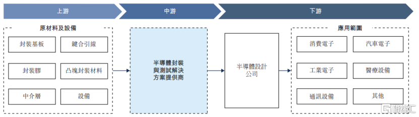 中游以半导体封装与测试解决方案提供商为主,利用上游原材料提供专业的封装与测试服务,这些已封装及测试产品随后供应至半导体设计公司。芯徳半导体就位于中游。
