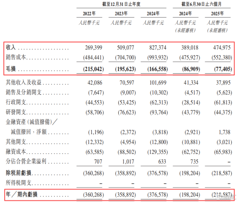 2022年、2023年、2024年及2025年1-6月(报告期),公司的收入分别为2.69亿元、5.09亿元、8.27亿元、4.75亿元,净利润分别为-3.6亿元、-3.59亿元、-3.77亿元、-2.19亿元,三年半累计亏损13.15亿元;报告期内毛利率分别为-79.8%、-38.4%、-20.1%、-16.3%。