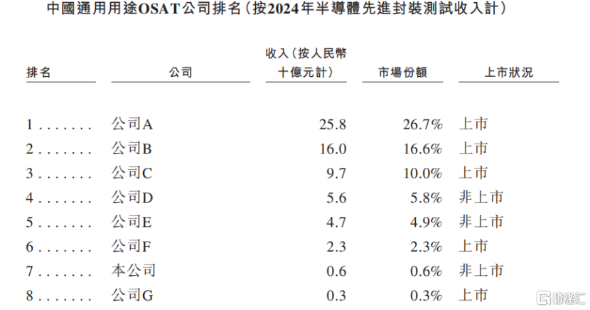 按半导体封装测试总收入计,芯徳半导体在中国通用用途OSAT公司中排名第7位,以2024年的收入计,市场份额为0.6%。