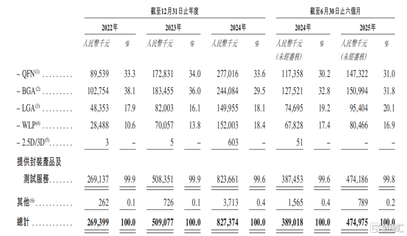 其中QFN、BGA贡献了公司大半的收入。2025年1-6月,公司来自QFN、BGA的收入占比分别为31%、31.8%;来自LGA产品的收入占比约20.1%。