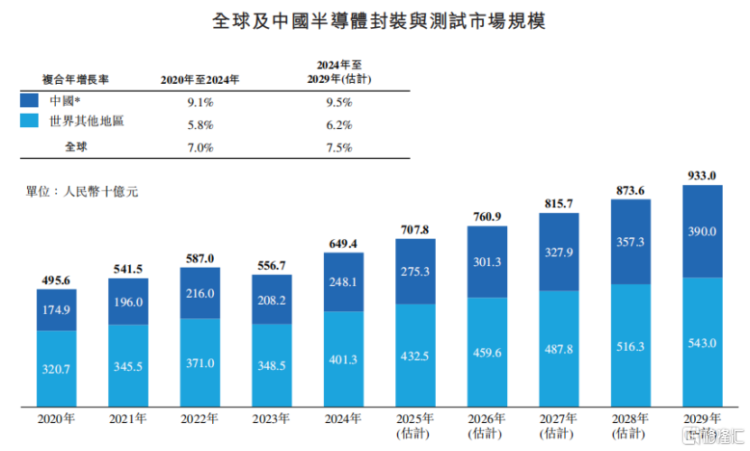 2024年,全球先进封装与测试市场规模为3124亿元。国内来看,2024年先进封装与测试市场规模于为967亿元,2020年至2024年的复合年增长率为13.3%。
