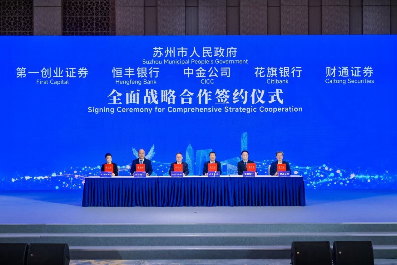 会上,苏州市政府与中金公司、恒丰银行、花旗银行、第一创业证券、财通证券签署战略合作协议及备忘录。
