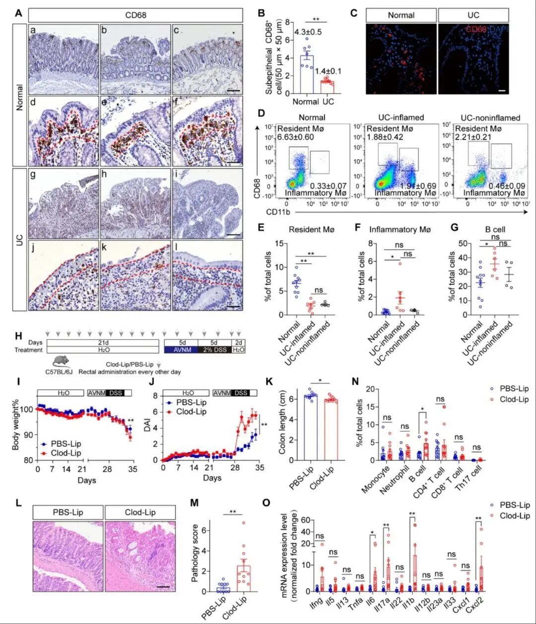 研究团队通过对比UC患者与健康人的结肠组织发现,UC患者上皮下方的CD68+巨噬细胞显著减少,且这一现象早于肠上皮损伤。这一发现如同揭开了UC发病过程的第一层帷幕,显示出巨噬细胞屏障的损伤可能是整个炎症的起点。随后的动物实验进一步证实,清除巨噬细胞虽不直接引发肠炎,但在轻微刺激下会显著加重炎症反应,这就像撤去了肠道的“警卫部队”,使得肠道在面临哪怕微小威胁时也显得不堪一击。