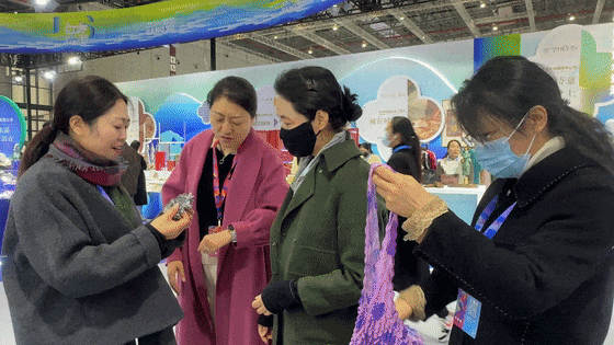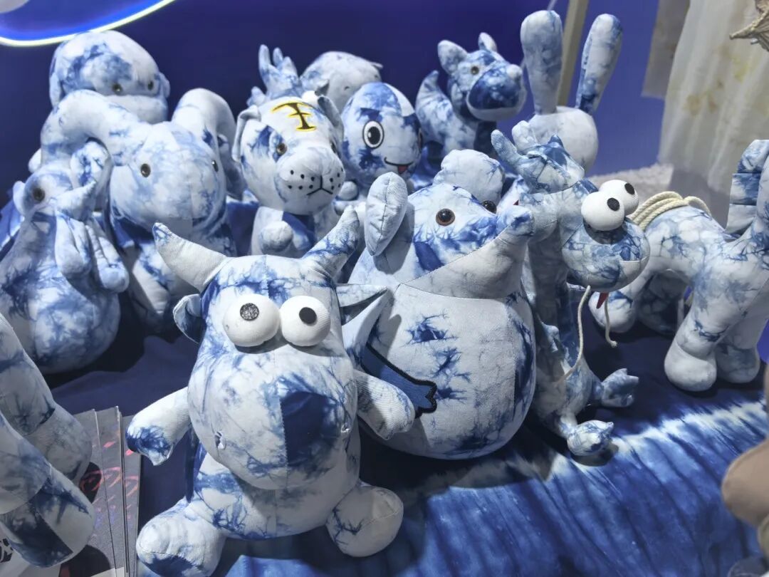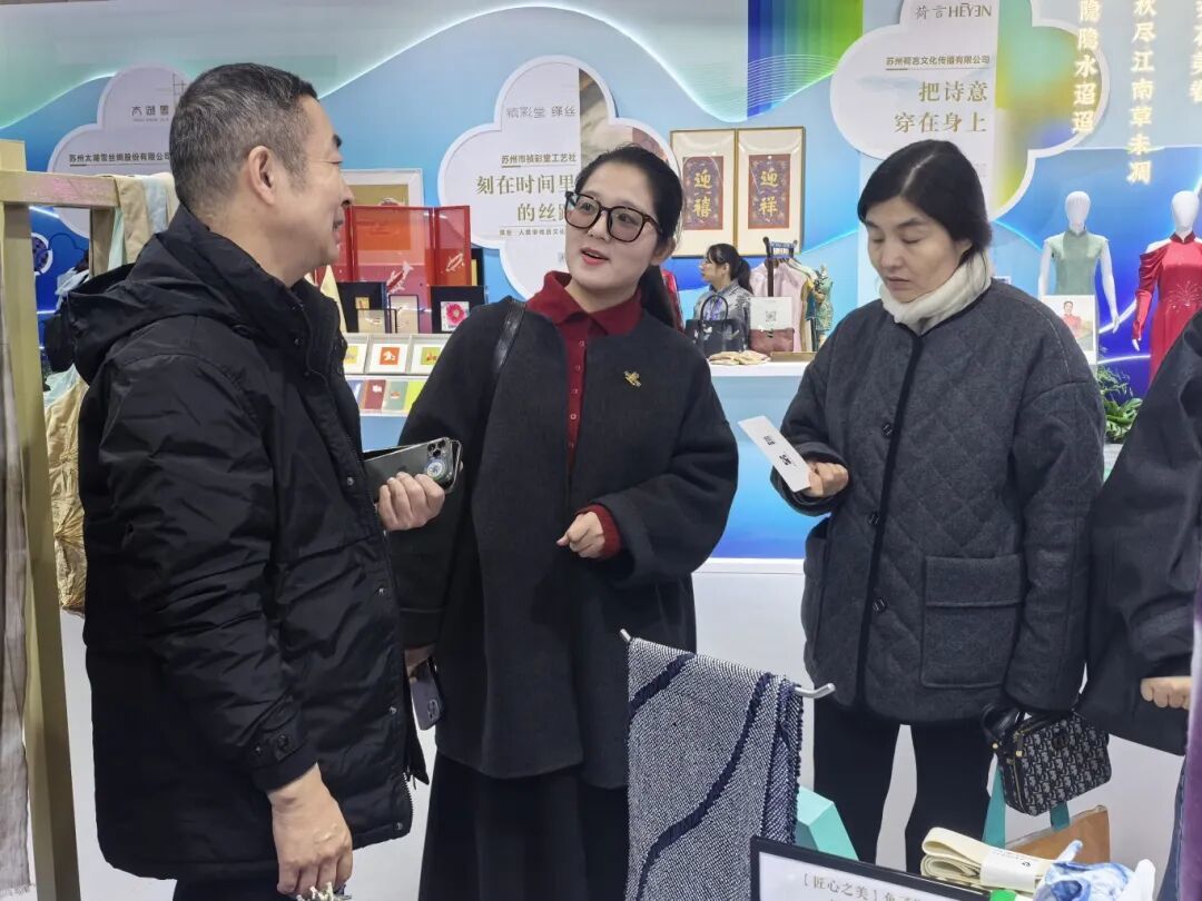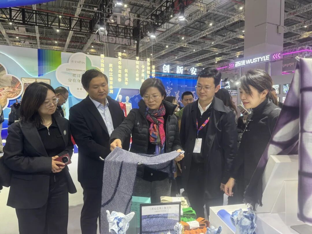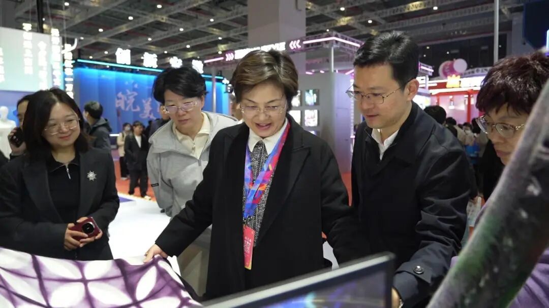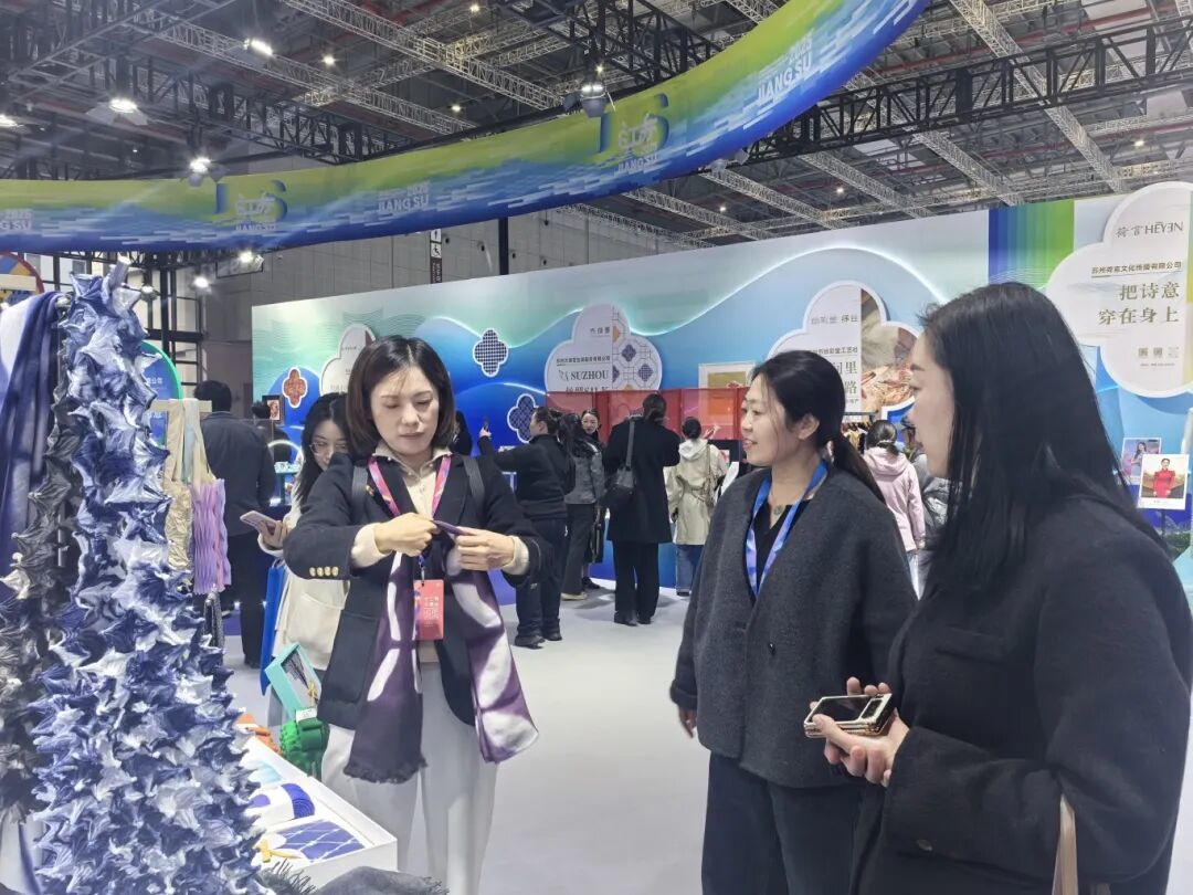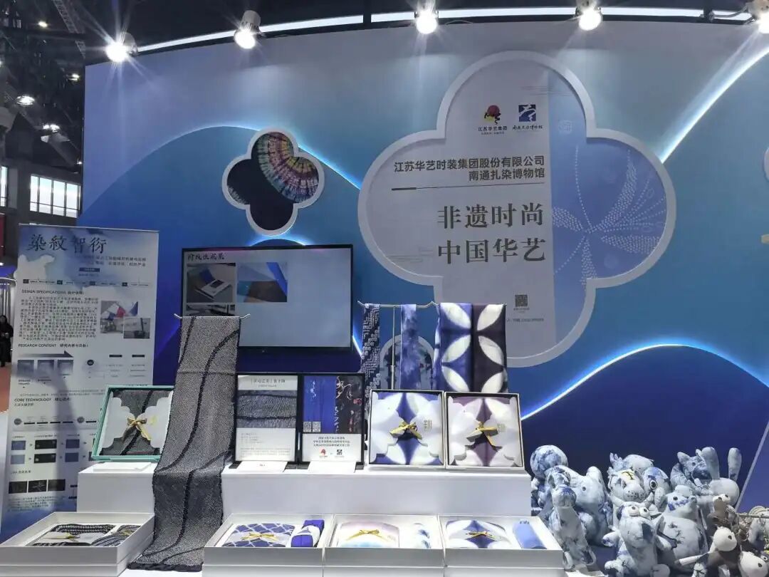 在江苏华艺集团的展台前,靛蓝色的绢布如流水般铺展,水墨纹样诗意晕染,东方韵味、水乡风情扑面而来,往来参观者纷纷驻足、细细赏玩。而这些精美绝伦的艺术品,均出自国内首条非遗扎染智能机器人生产线,是非遗保护与人文经济融合发展的典范。