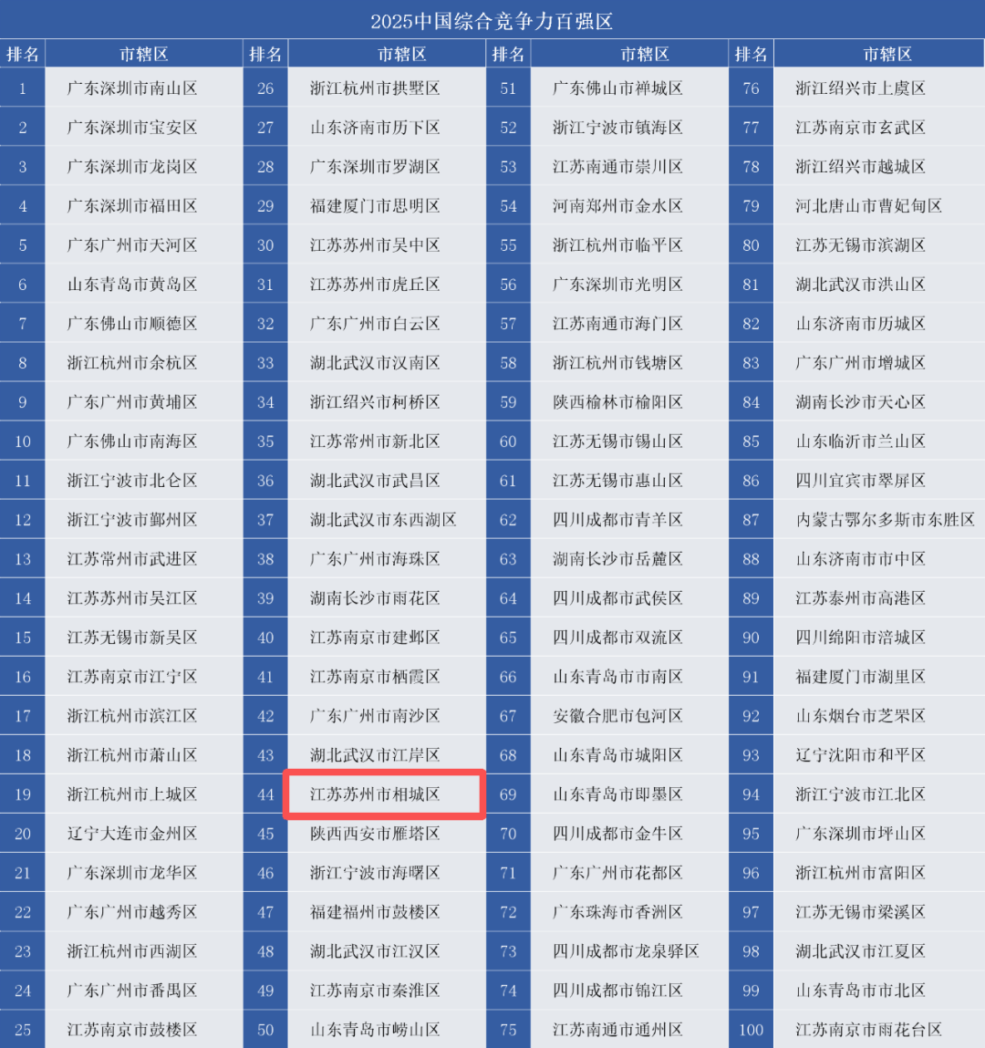 近日,《中国县域发展监测报告2025》发布,“2025中国综合竞争力百强区”名单揭晓,相城区综合实力位列全国第44位,较去年再进1位,较前年前进2位。