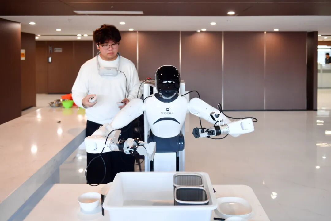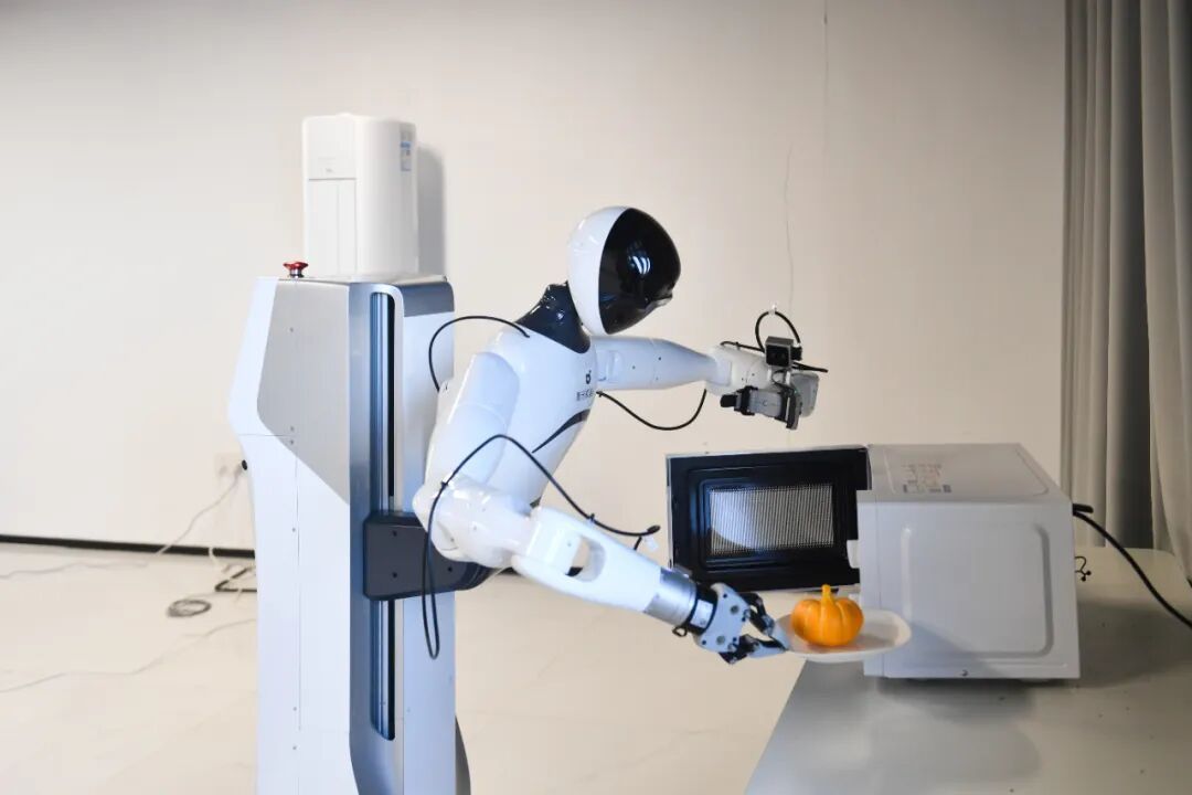 只见数据采集员熟练地操控手柄,一旁的机器人便“活”了过来:它能灵活地移动,伸出机械臂,将散落的杂物一一归位;可以精准地从桌子上端起餐盘,平稳地送入微波炉并启动加热;甚至能细致地“手持”抹布,沿桌面轨迹进行擦拭清洁。