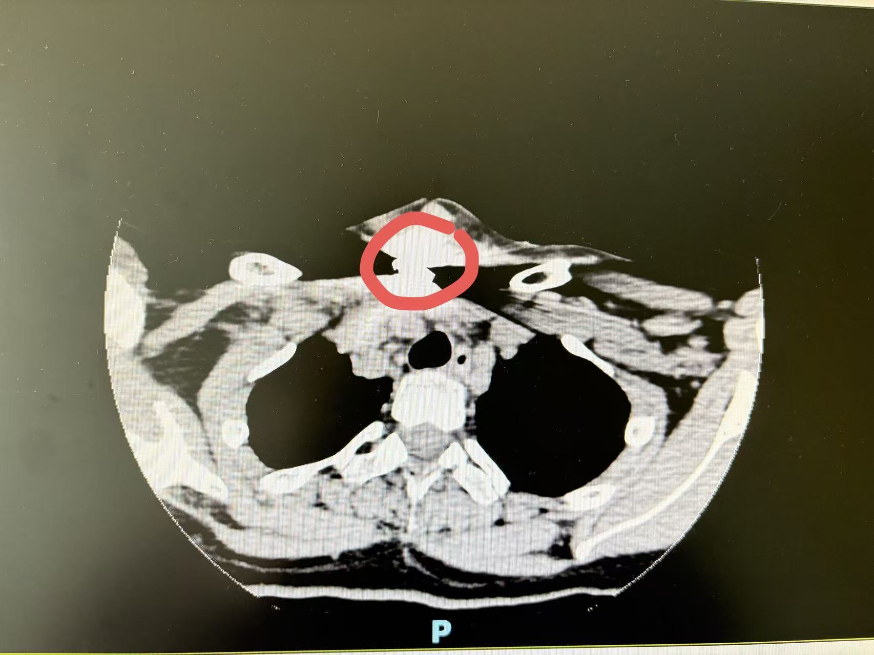 原来,颈部CT显示,这枚大小约1×2cm小小的零件出现在T2-3水平颈根部,周围组织的肿胀和积气,最致命的是它深深嵌入了颈部的“生命禁区”——紧邻大血管、神经和气管,非常危险。
