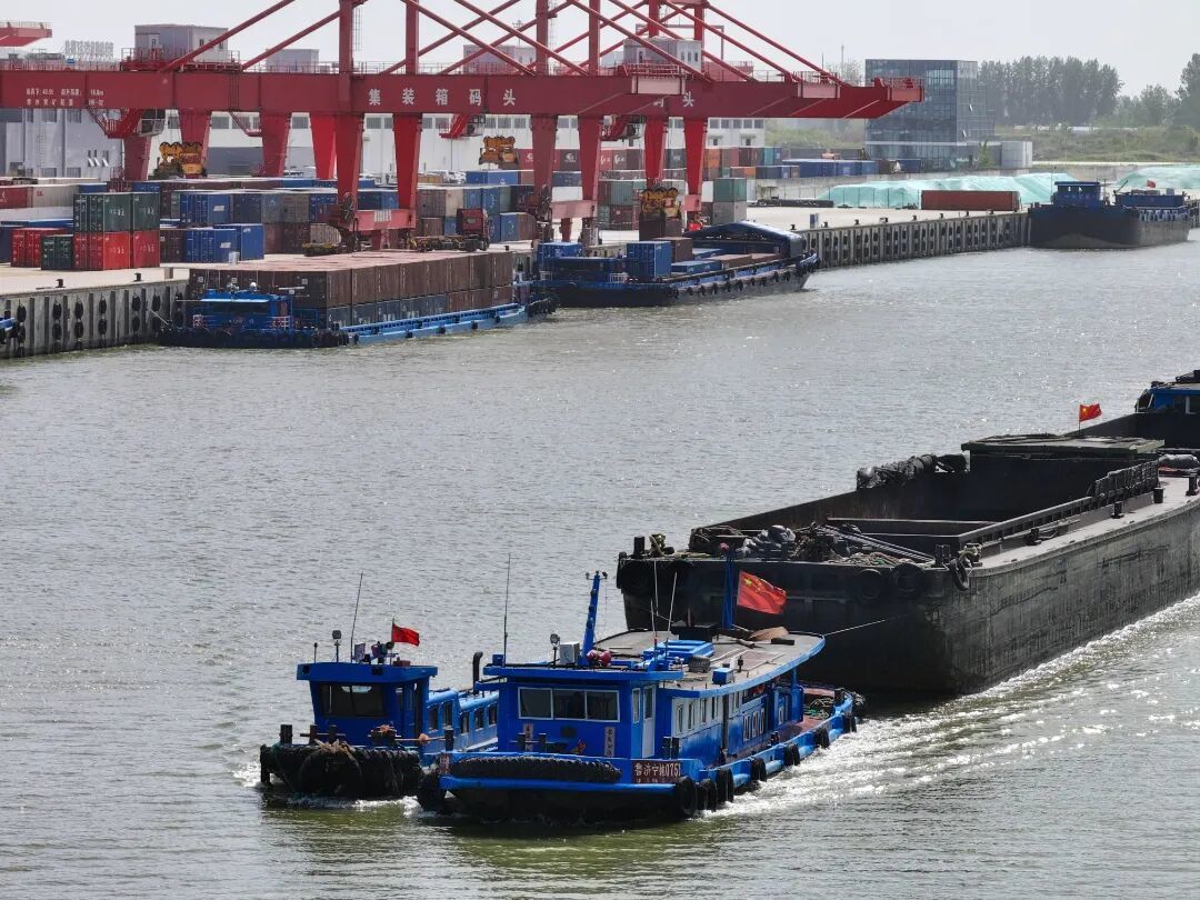 徐州港双楼作业区集装箱码头,吊车有序作业,运输车辆川流不息,一派繁忙景象。