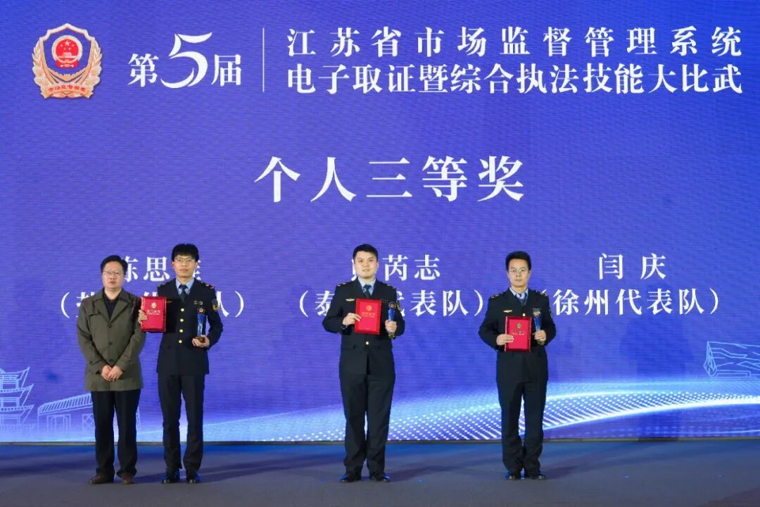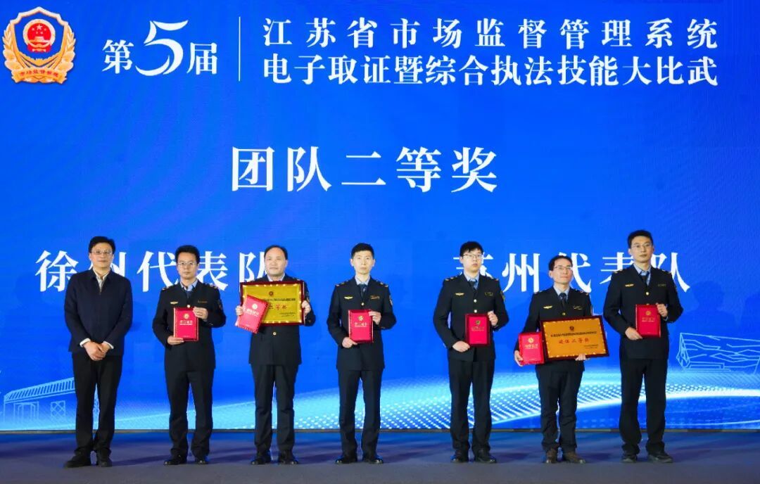 近日,第五届江苏省市场监管系统电子取证暨综合执法技能大比武成功举办。代表徐州局参赛的闫庆、孔骁骁凭借扎实的专业功底、出色的临场发挥和紧密的团队协作精神,最终斩获团体二等奖和个人三等奖(闫庆)。