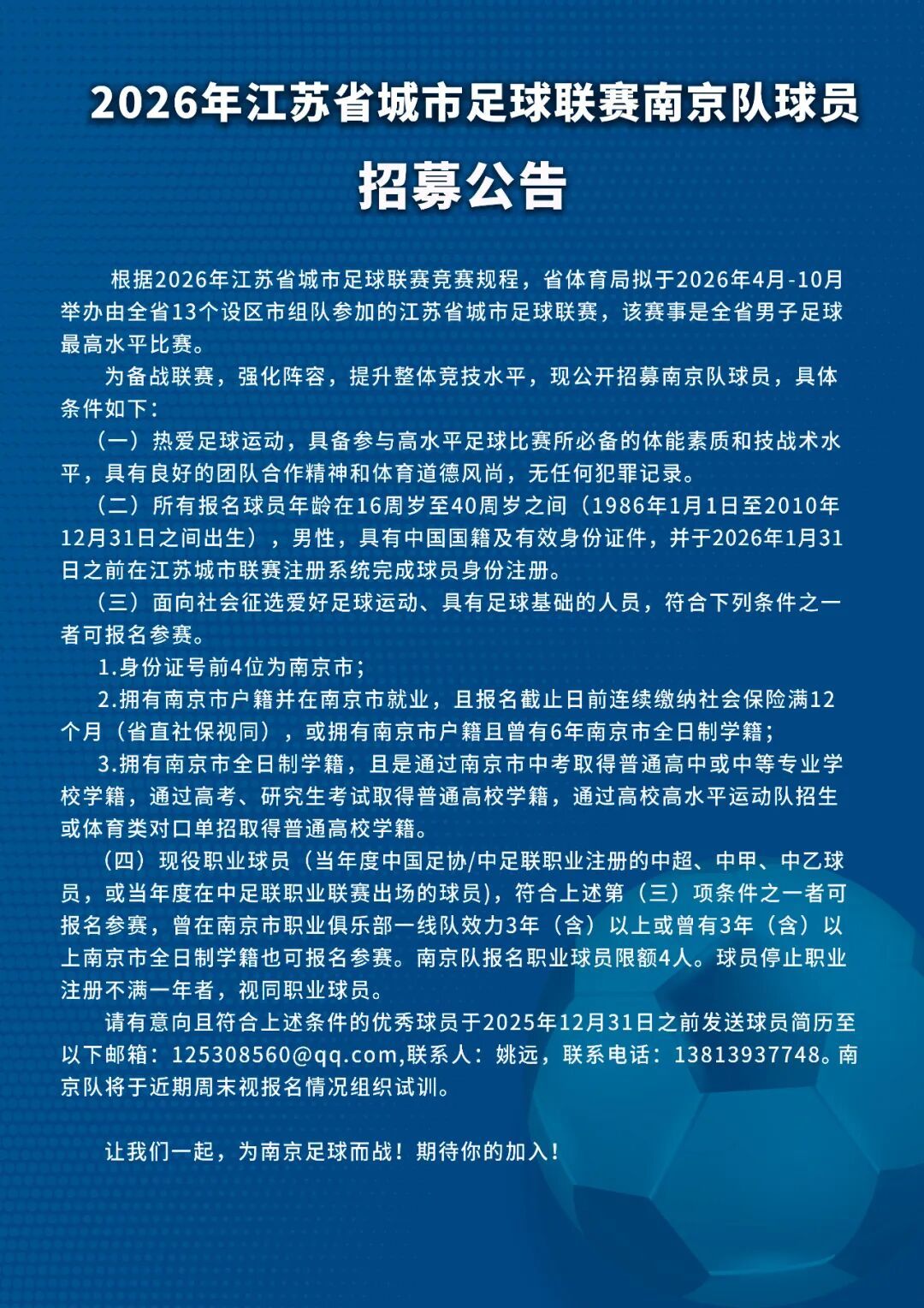 12月8日晚,南京市足协正式发布了2026年江苏省城市足球联赛南京队的招募公告。报名条件如下: