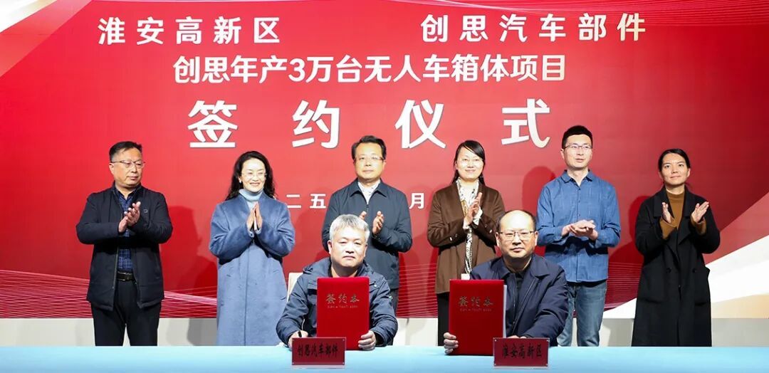 聚焦强链筑根基,着力补链促循环。12月12日,创思年产3万台无人车箱体项目签约落户淮安高新区,作为区内九识智能无人车箱体的唯一供应商,该项目的落地将为本地智能装备制造产业注入新动能。区委书记、淮安高新区党工委书记邓萌,区委常委、淮安高新区管委会副主任胡娟娟以及浙江创思汽车部件有限公司董事长彭建飞共同见证项目签约。