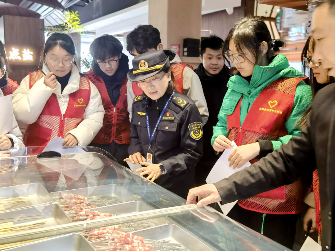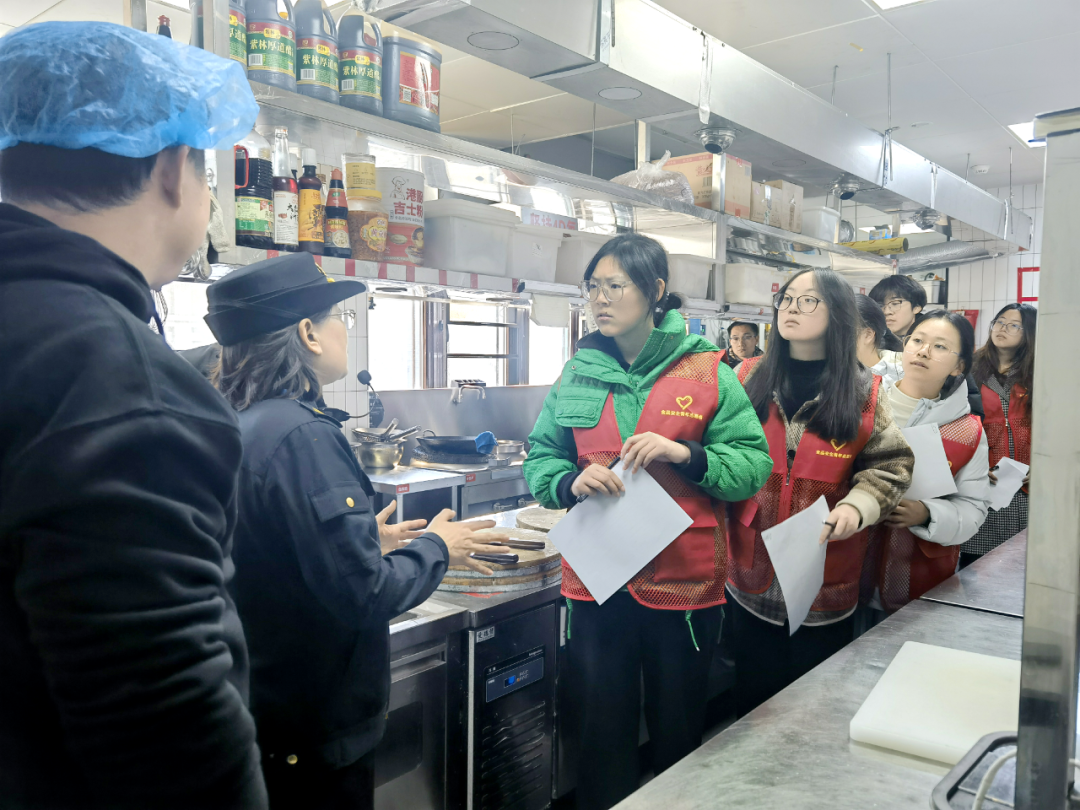 活动中,同学们获颁“食品安全社会监督员”证书,深入餐饮后厨及食品加工一线,围绕人员健康管理、食材贮存、加工操作、餐具消毒、“三防”设施等重点环节开展实地检查学习。执法人员结合现场情况讲解监管要求,志愿者积极提问互动,形成“边查边学、寓教于检”的实践模式。