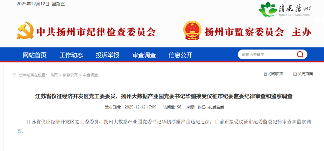 江苏省仪征经济开发区党工委委员、扬州大数据产业园党委书记华鹏涉嫌严重违纪违法,目前正接受仪征市纪委监委纪律审查和监察调查。