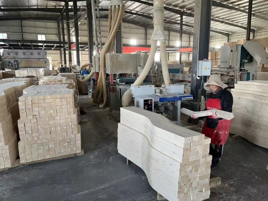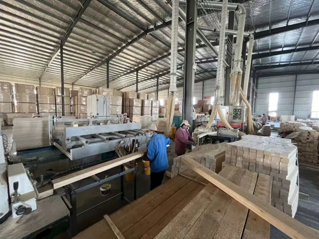 在徐州谦诚木业有限公司的生产车间里,自动化设备高速运转,机器轰鸣声不绝于耳。工人们在各自岗位上忙碌不停,熟练地将加工好的板材转运至下一道工序,整个生产线紧凑有序、运转高效。