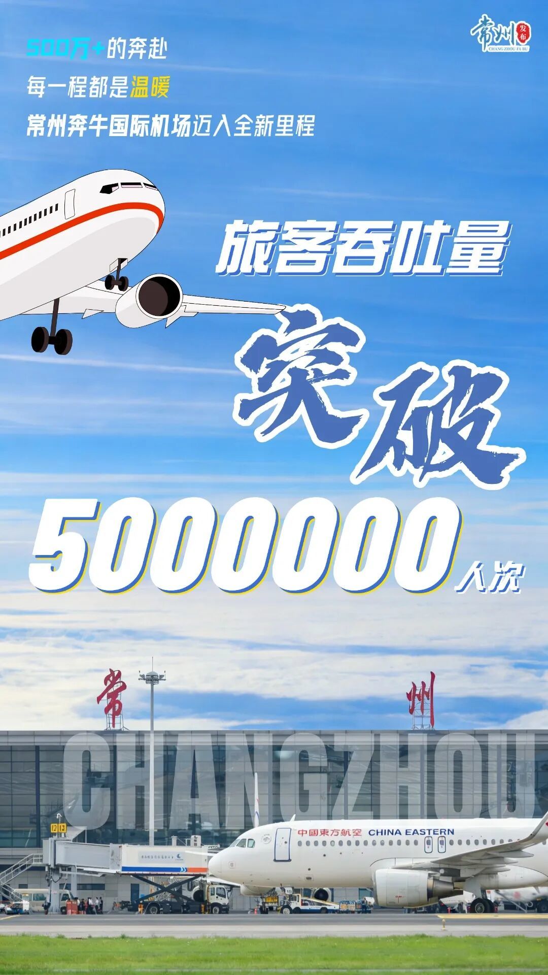 2025年12月23日,常州奔牛国际机场举行高质量发展活动,宣布该机场年旅客吞吐量首次突破500万人次大关,标志着常州机场正式成为中型机场。市委副书记、市长周伟和东航江苏公司总经理张兰海共同为第500万名旅客送上纪念牌及荣誉证书。