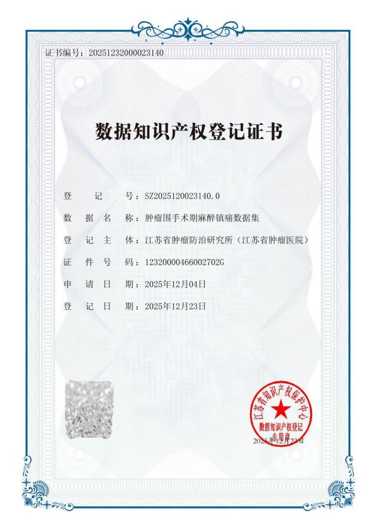 近日,江苏省肿瘤医院(南京医科大学附属肿瘤医院)在医疗数据要素创新应用领域斩获突破:医院申报的“肿瘤围手术期麻醉镇痛数据集”正式通过江苏省数据知识产权登记审查,成为全省首家完成数据知识产权登记的省级医疗机构,成功实现省级医疗机构数据知识产权登记“零的突破”。